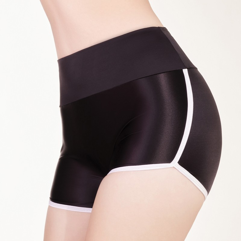 High waist, comfy wide waistband, elastic waistband, mini length boyshorts style, tight fitting.