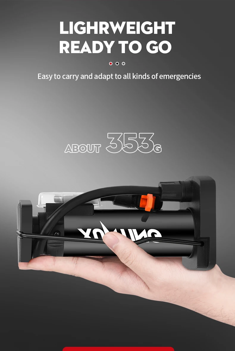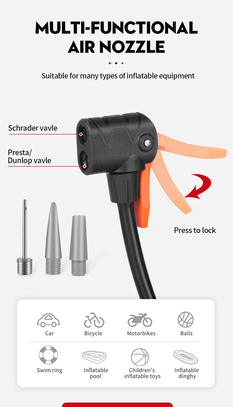 【Multifunctional & Compatible Valves】 Upgraded designed valve is well compatible with Presta, Schrader, Dunlop valves, which is not only for bikes, but also for electric vehicles, motorcycles or even a car ( just for emergency ). The extra gas needle and valve in the package help to pump up balls, balloons, swimming rings, inflating boats, etc.