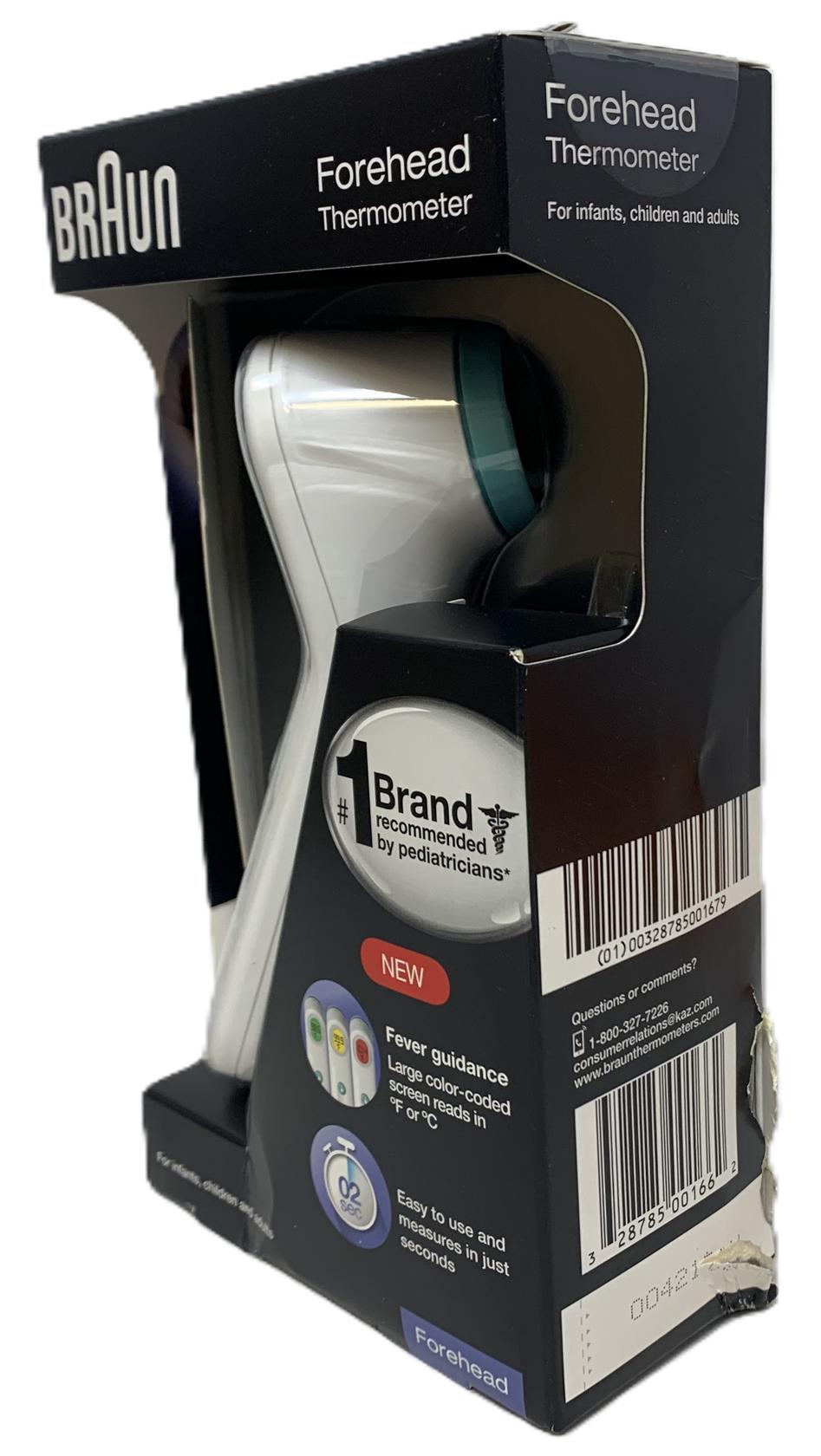 The Braun Forehead Thermometer offers both convenience and professional accuracy. A gentle touch on the center of the forehead provides accurate readings in just seconds. Its large, easy-to-read screen helps determine the severity of your child's temperature by displaying green if there is no fever, yellow if there is a slight fever, and red for a high temperature. The Braun Forehead Thermometer is designed for all age groups. Braun Thermometers are used by more pediatricians' offices than any other infrared thermometer brand.