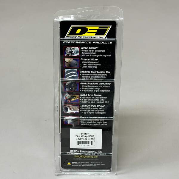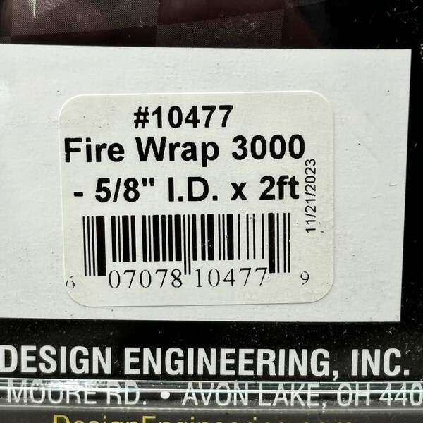 DEI DESIGN ENGINEERING INC Fire Wrap 3000 Withstands 500°F Condition: New Size: 5/8" I.D. x 2ft Withstands 500°F Color: Black Model: 10477 Description: Withstands direct heat up to 500°F Protects against oil, dirt, road grime & other contaminates Pliable enough to shape & fit tightest bends