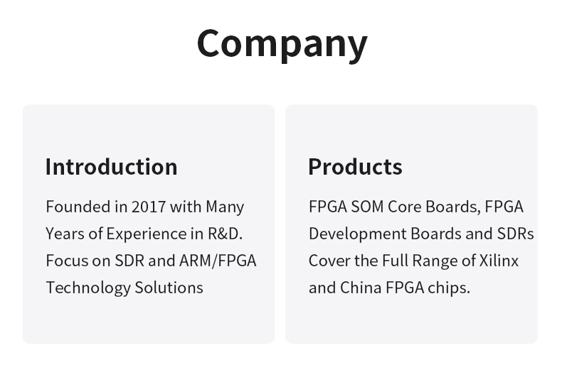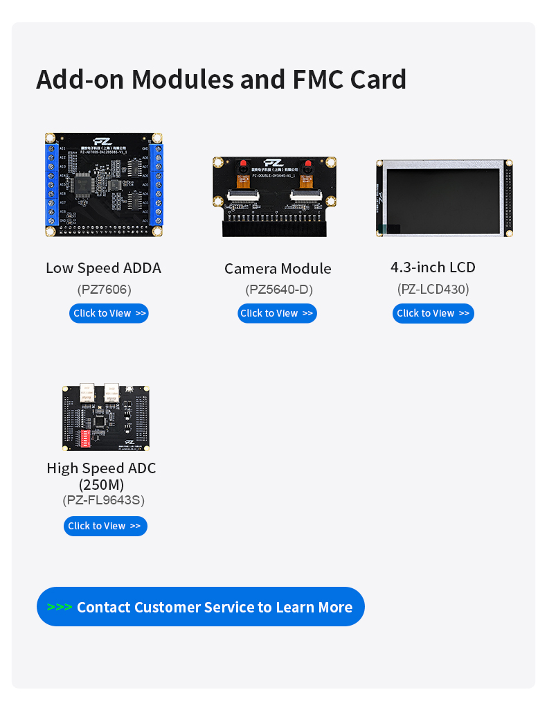 Puzhi Electronic Technology (Shanghai) Co., Ltd. has full series of Xilinx ARM/FPGA core boards, development boards,software radio,and custom services are also available, The company has a full range of products, a wide range of applications, the products are exported to all over the world, covering industrial control, medical, intelligent AI, image processing and other areas of application needs,