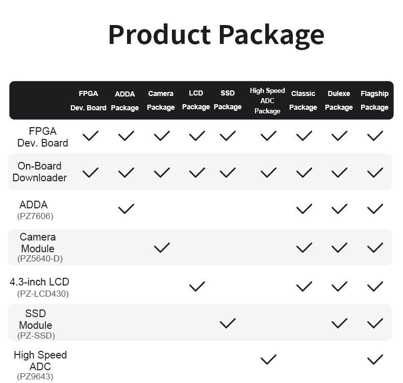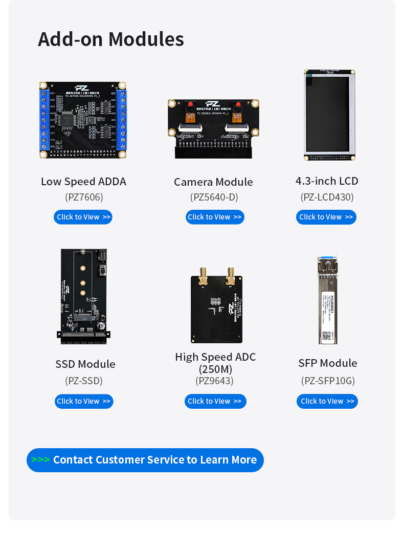 Puzhi Electronic Technology (Shanghai) Co., Ltd. has full series of Xilinx ARM/FPGA core boards, development boards,software radio,and custom services are also available, The company has a full range of products, a wide range of applications, the products are exported to all over the world, covering industrial control, medical, intelligent AI, image processing and other areas of application needs,