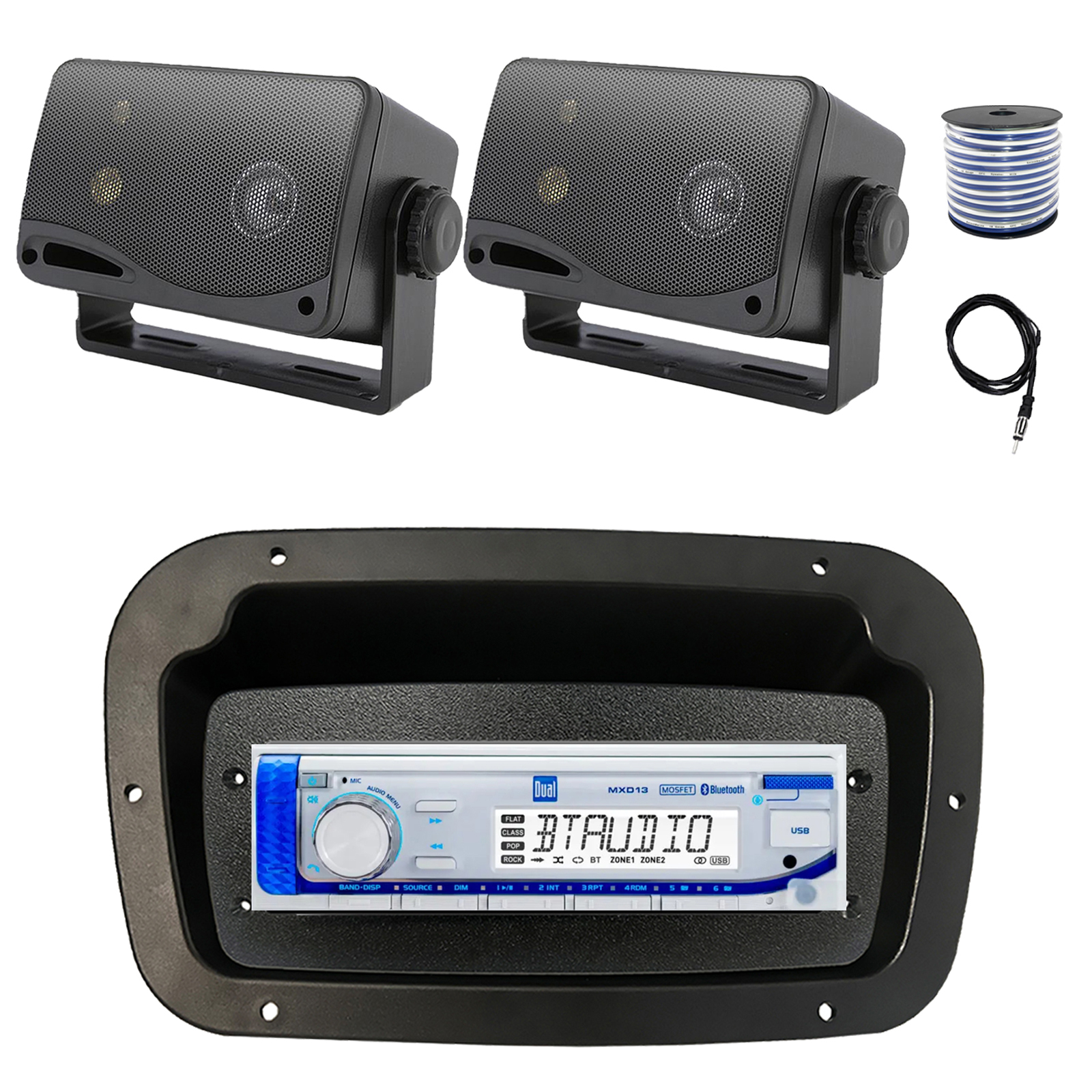 Dual MXD13 Single DIN Bluetooth Marine MP3 AM/FM Stereo Receiver, Spa bezel, Adapter Plate, 22" Radio Antenna, Wire, 2x 3.5'' 200 Watt Max 3-Way Indoor/Outdoor Wall Mount Speaker (Black)