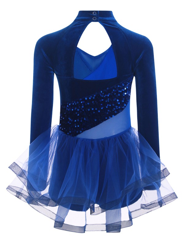 Velvet dance dress with mesh patchwork at the waist and cutout design, mock neck with press buttons for easy wearing.