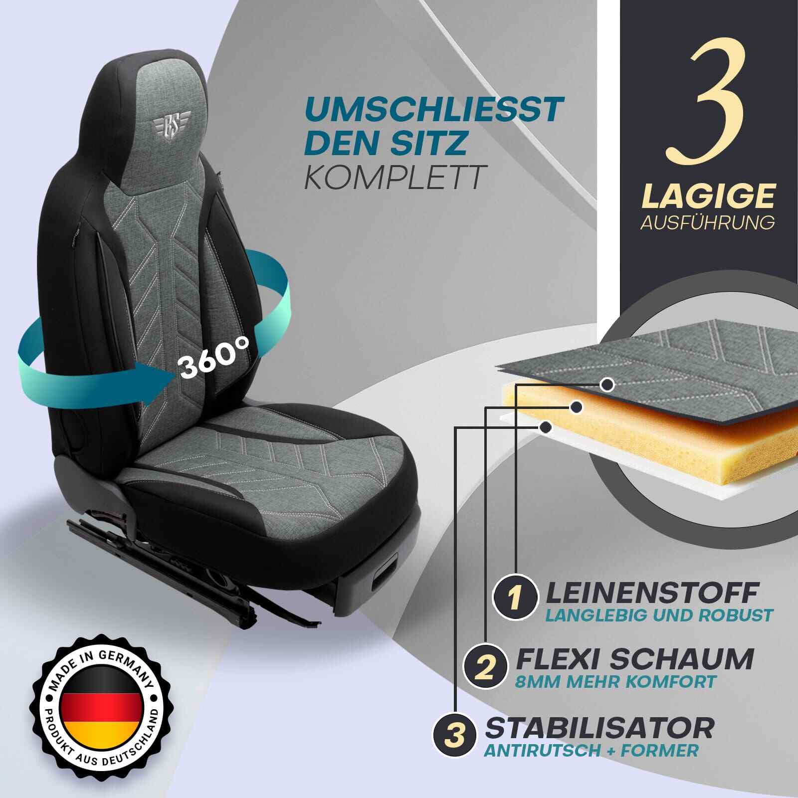 Die stabile Nähte und die Verwendung von hochwertigen Materialien aus der Automobilindustrie gewährleisten eine lange Lebensdauer der Sitzbezüge. Die dreilagige Konstruktion bietet Antirutscheigenschaften und hilft dabei, die Form der Bezüge selbst nach längerem Gebrauch zu erhalten.