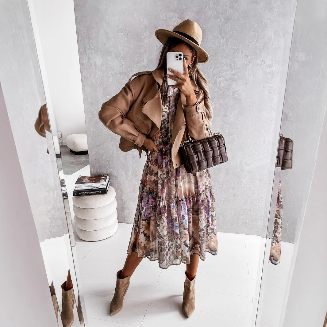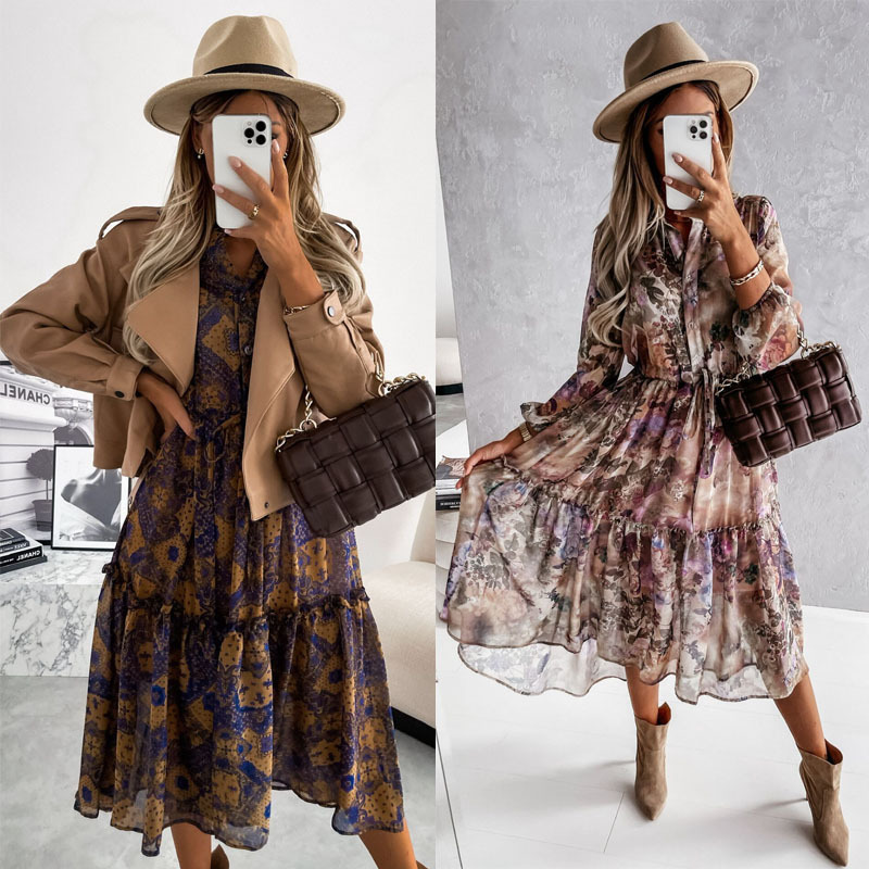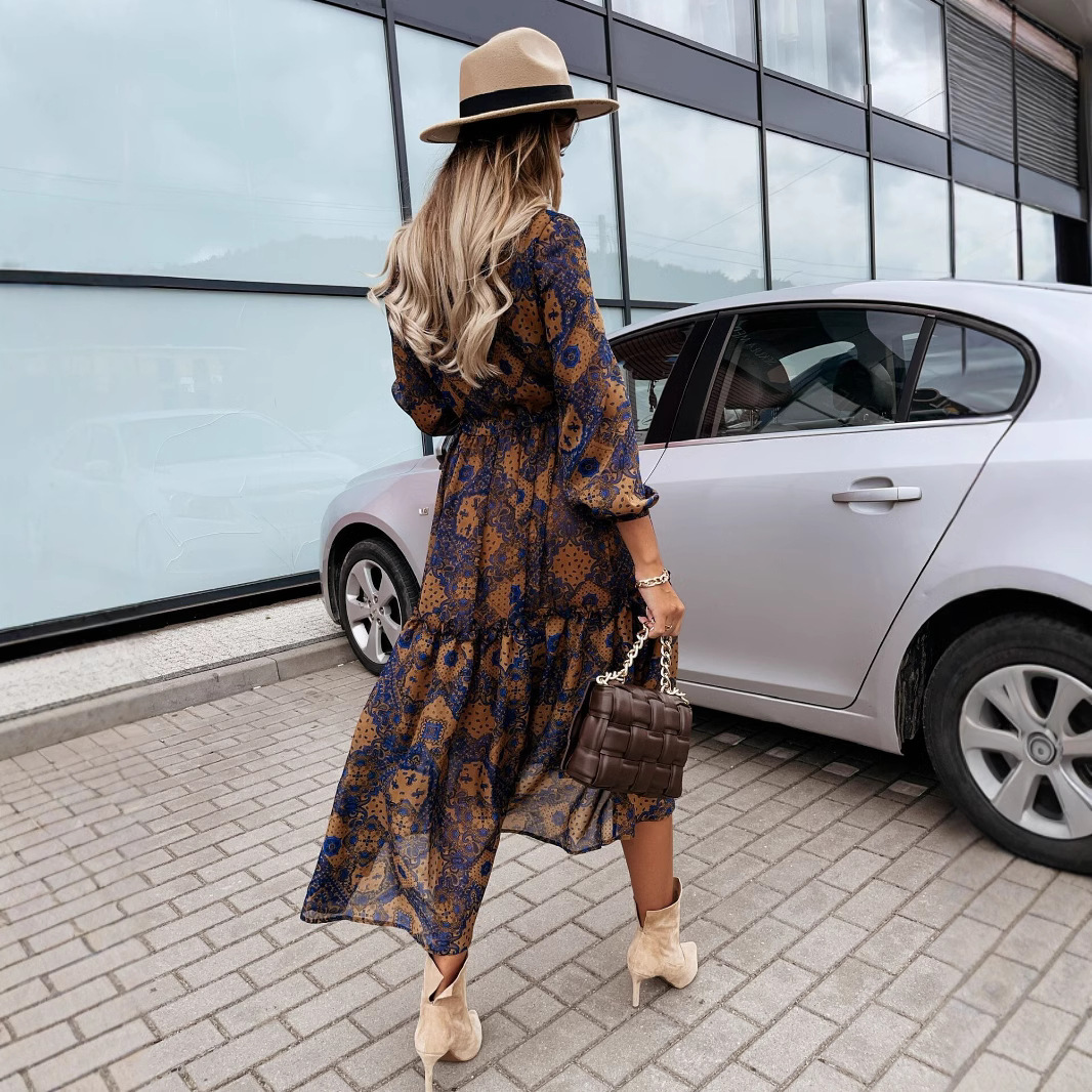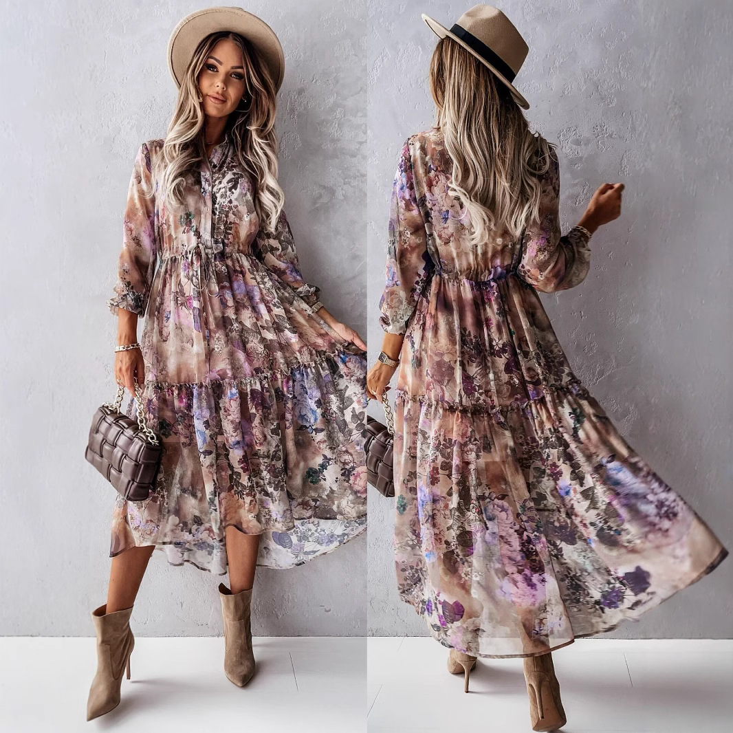 Bohemian Long-sleeved V-neck Tie-up, Floral Medium-length Dress, Big Swing Skirt