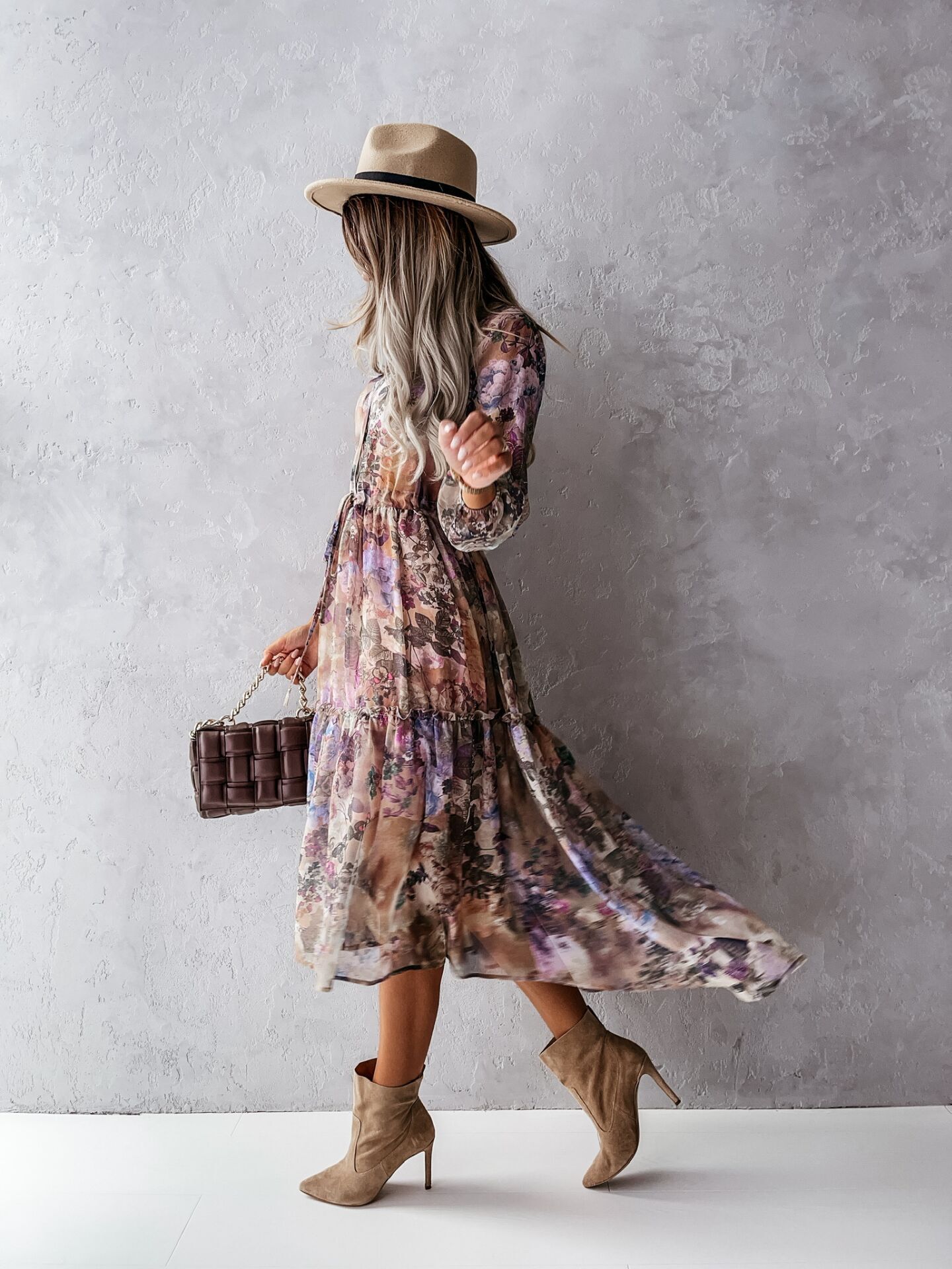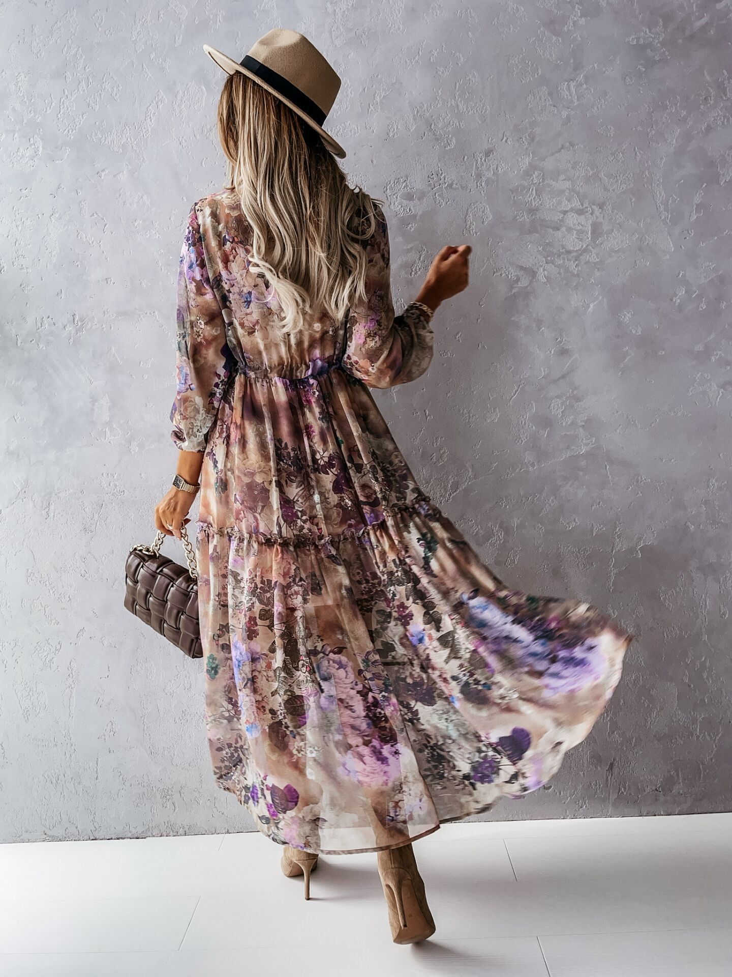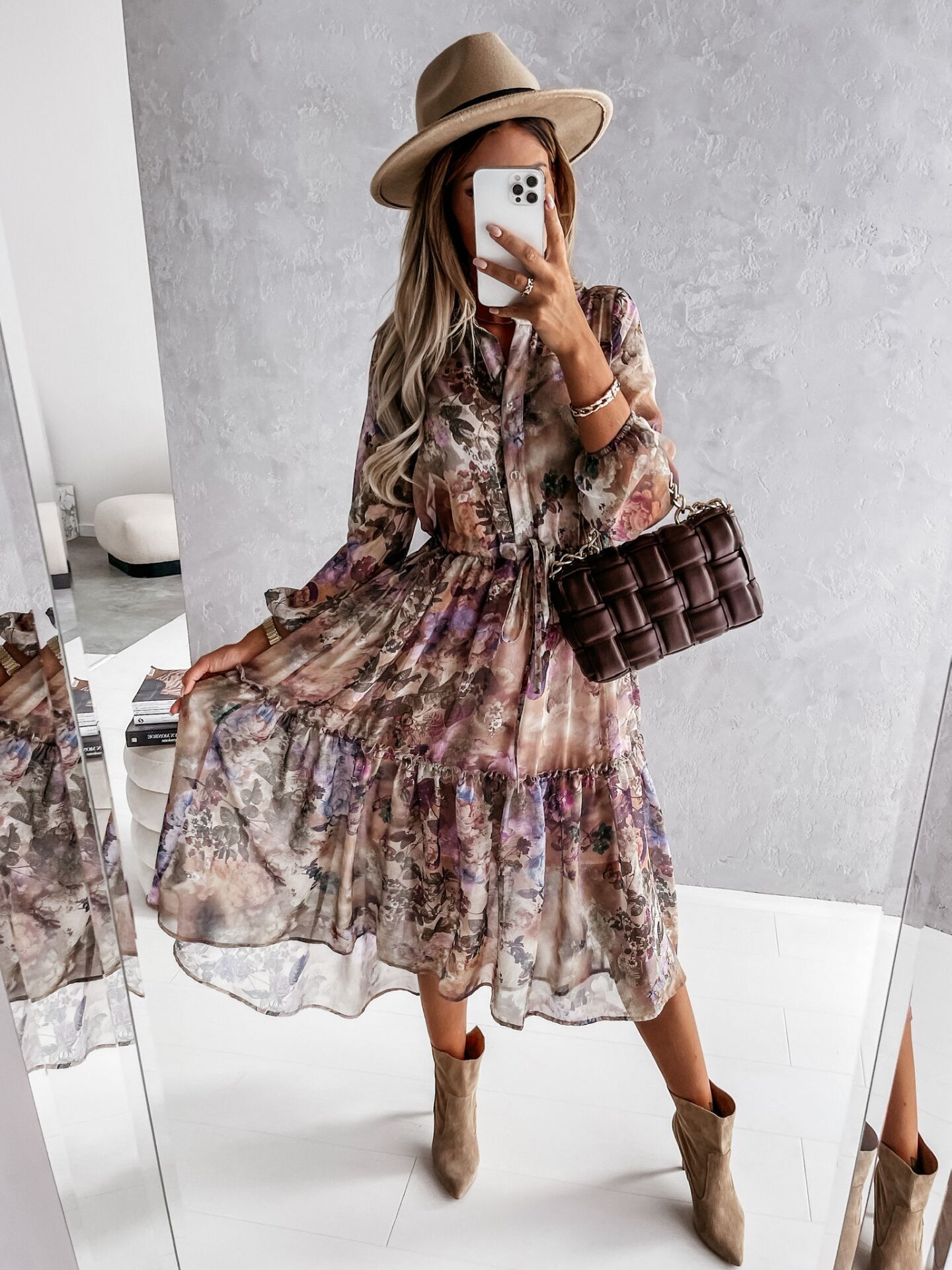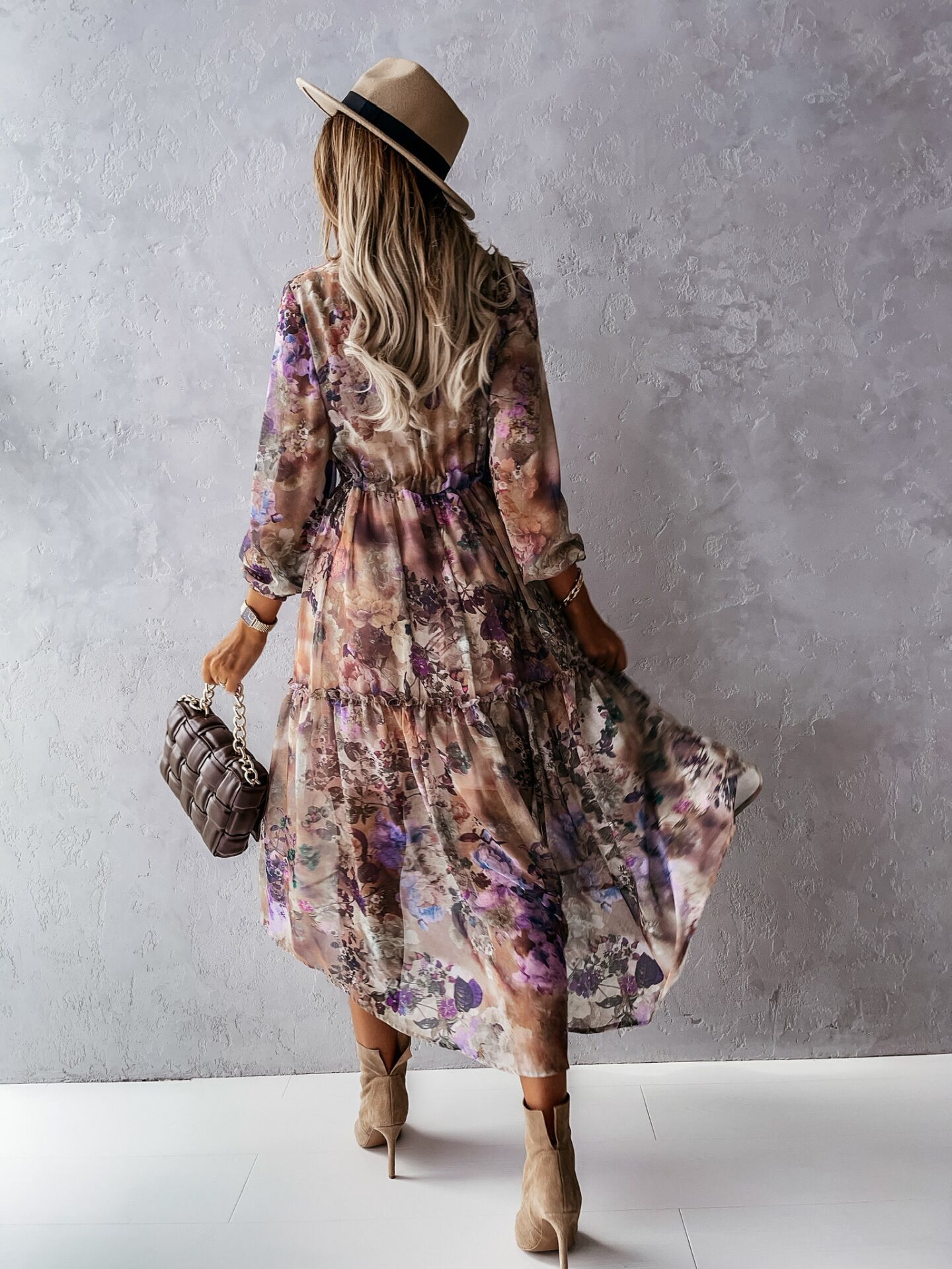 Bohemian Long-sleeved V-neck Tie-up, Floral Medium-length Dress, Big Swing Skirt