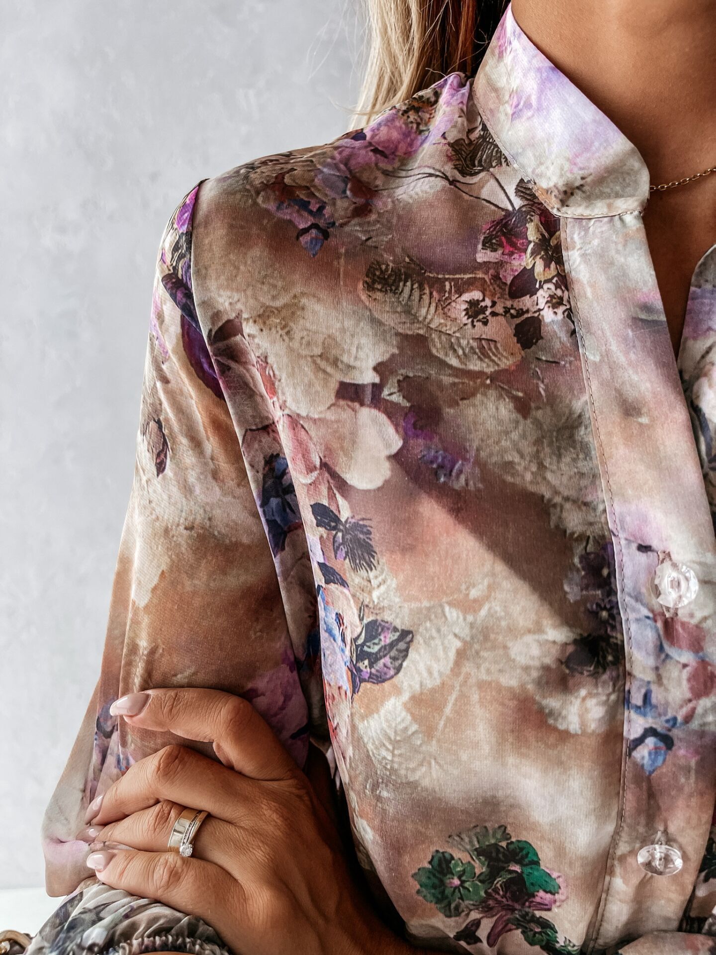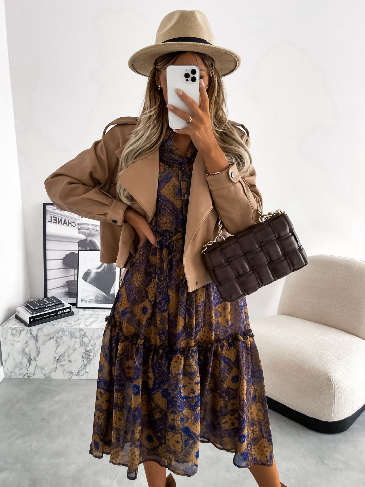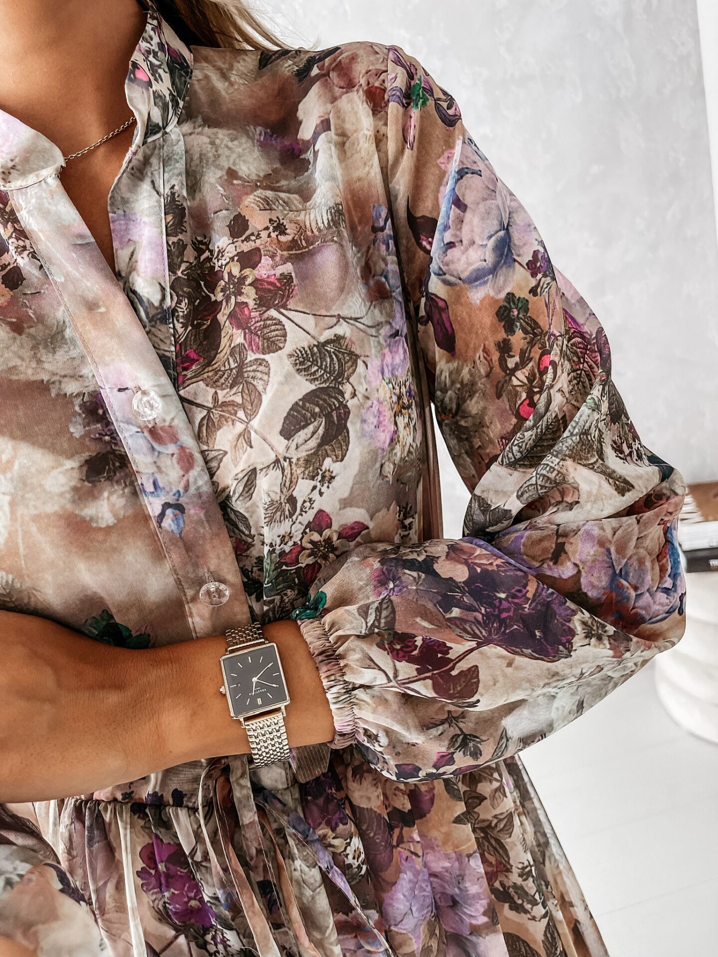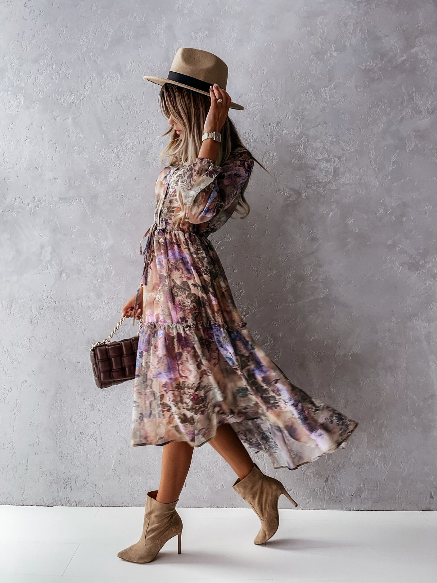 Bohemian Long-sleeved V-neck Tie-up, Floral Medium-length Dress, Big Swing Skirt