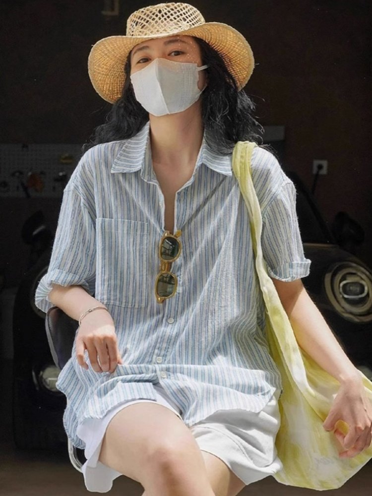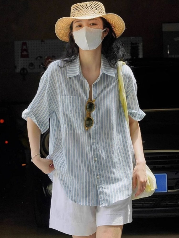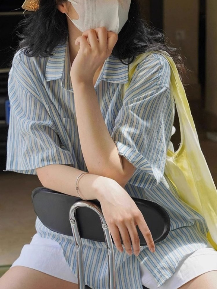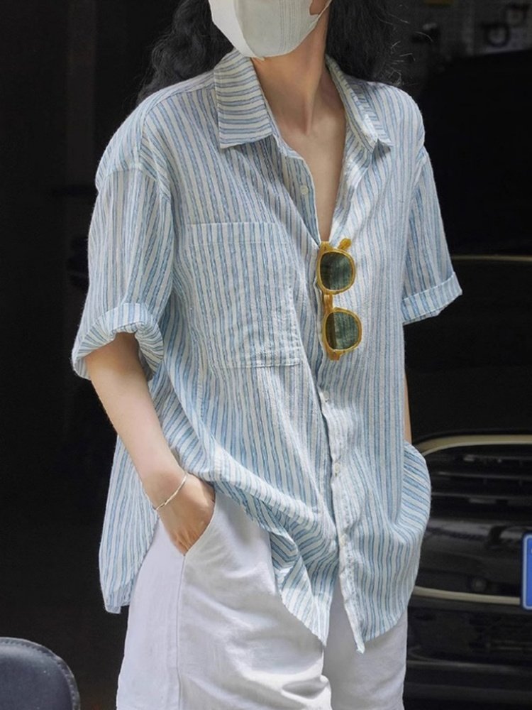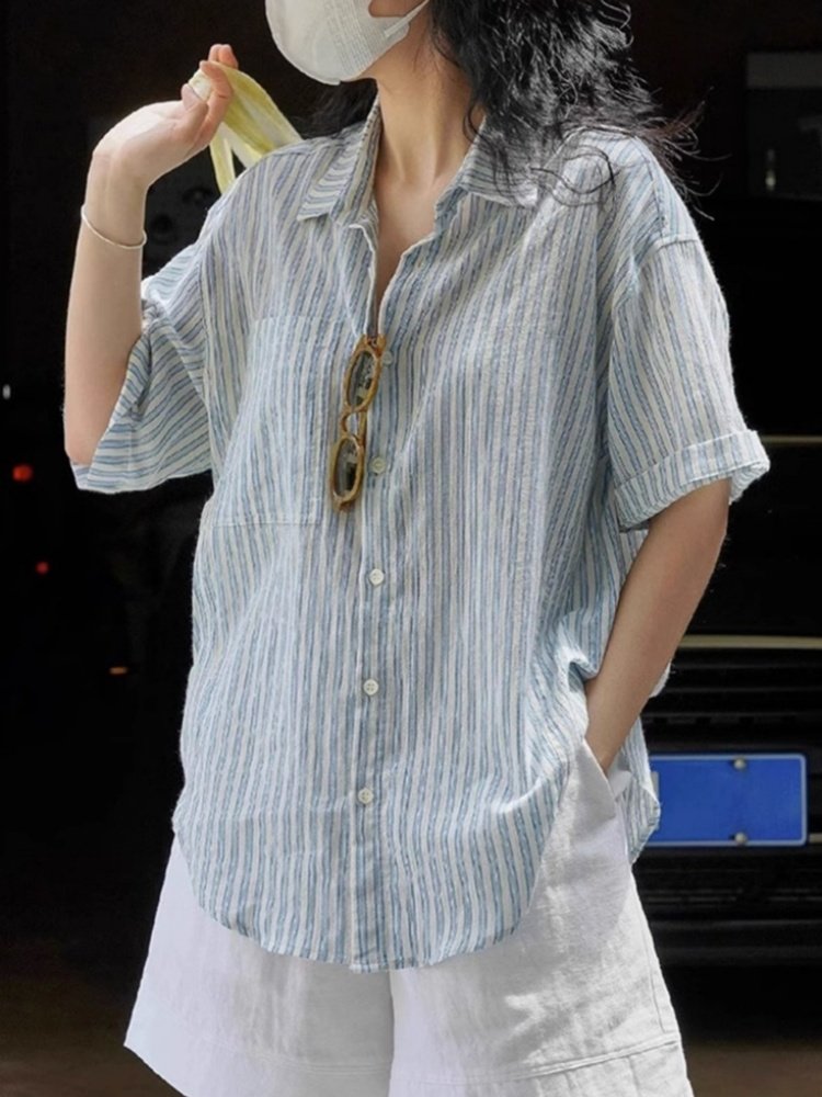 Pure Cotton Linen, Striped Short-sleeved Sunscreen Shirt Summer Thin Linen Shirt