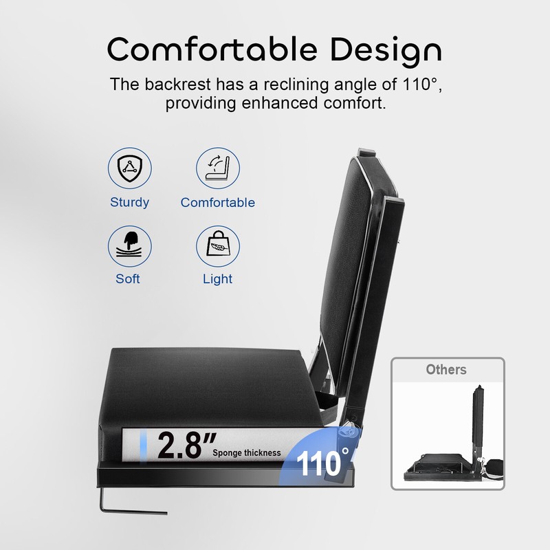 - Ultimate Comfort for Prolonged Enjoyment: The ultra-padded foam backs and cushioned seat provide maximum support and comfort, making you feel like you're sitting on a couch at home. Experience bliss with our specially designed backrest featuring a 110-degree angle between the backrest and the seat, meticulously crafted for optimal human comfort. Perfect for long games or events, this stadium chair ensures you can cheer on your team without any back or butt tiredness.