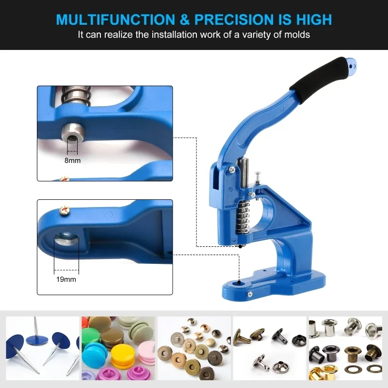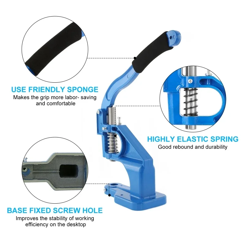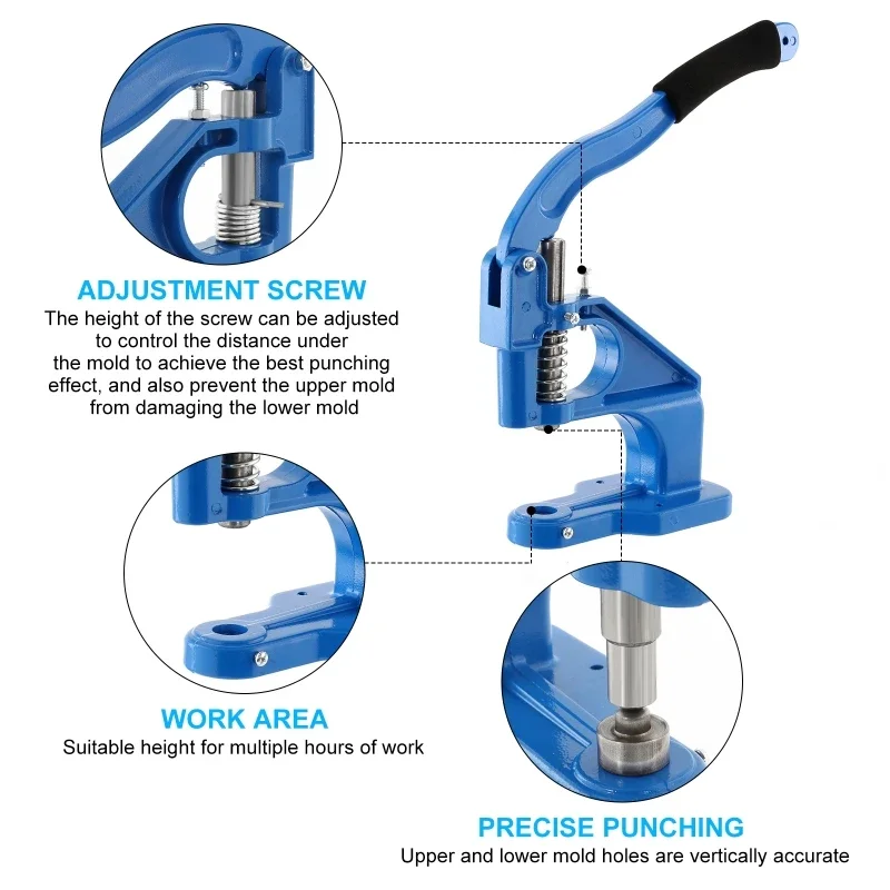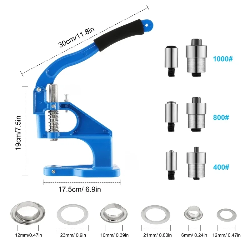 - This practical grommet machine is very essential equipment for dress makers, arts & crafts, sign shops & manufacturers, etc. - Applicable for banners, signs, awnings, posters, curtains, digital printing, scrapbooking, corsets, belts, bags, shoes and the like. Features: * Interchangeable dies to meet different needs. * Allowing grommets to be set further into the material, not just along the edge. * Accommodating more material (not applicable for leather). * Easy seating the grommets. * Extra long handle grip design to save energy. * Convenient operation. * Can stand alone or be mounted to a tabletop with 3 mounting holes. * Ideal for craft and industrial use. Specification: Name: Grommet Machine Material: Aluminum alloy Inner diameter: 6/10/12mm Buttonhole color: silver / Gold Number of buttonholes: 1500Pcs Color:Blue Packing Included: 1 x Grommet Machine 3 x Dies (Inner Diameter 6mm, 10mm, 12mm) 1500 Sets of Grommets OR 1 x Grommet Machine Note: 1. Please allow 1-3cm (0.4-1.18") difference due to manual measurement and slight color variation for different display setting. 2. Due to the light and screen difference, the item's color may be slightly different from the pictures. Please understand.
