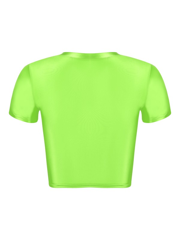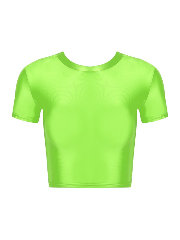 Glossy appearance, solid color, classic round neck and short sleeve, slim fit, cropped length.