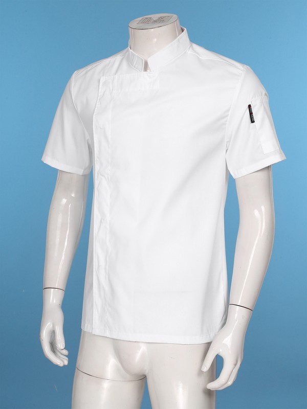 Unisex short sleeve chef jacket, stand collar looks professional, press buttons for easy wearing. Come with a hat.