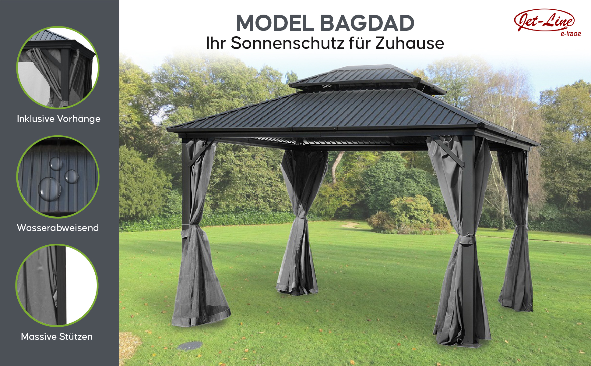 Der Alu Pavillon BAGDAD 3,65x3,65 m Metalldach Pergola Aluminium ist ein XXL-Pavillon, der Ihnen ein festes Metalldach und einen robusten Rahmen aus Aluminium bietet. Da der Rahmen aus Aluminium gefertigt ist, ist dieser rostfrei und langlebig, sodass Sie lange Freude daran haben werden. Mit seiner Jet-Line-Technologie ist er ein echter Blickfang und ein Muss für jeden Garten.