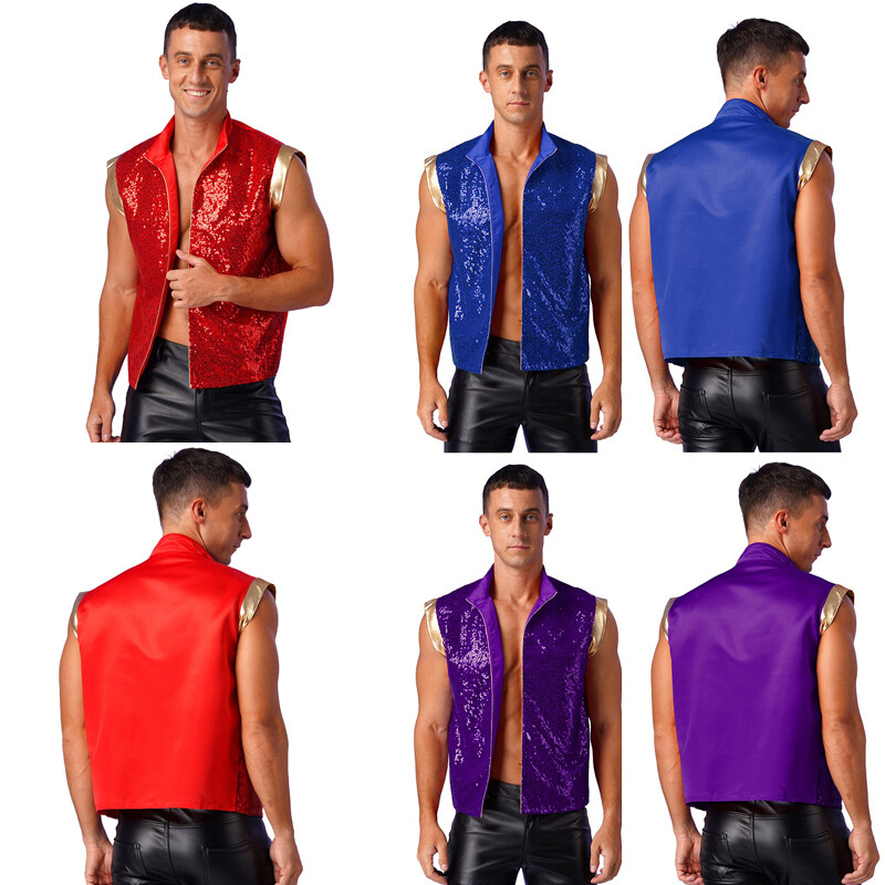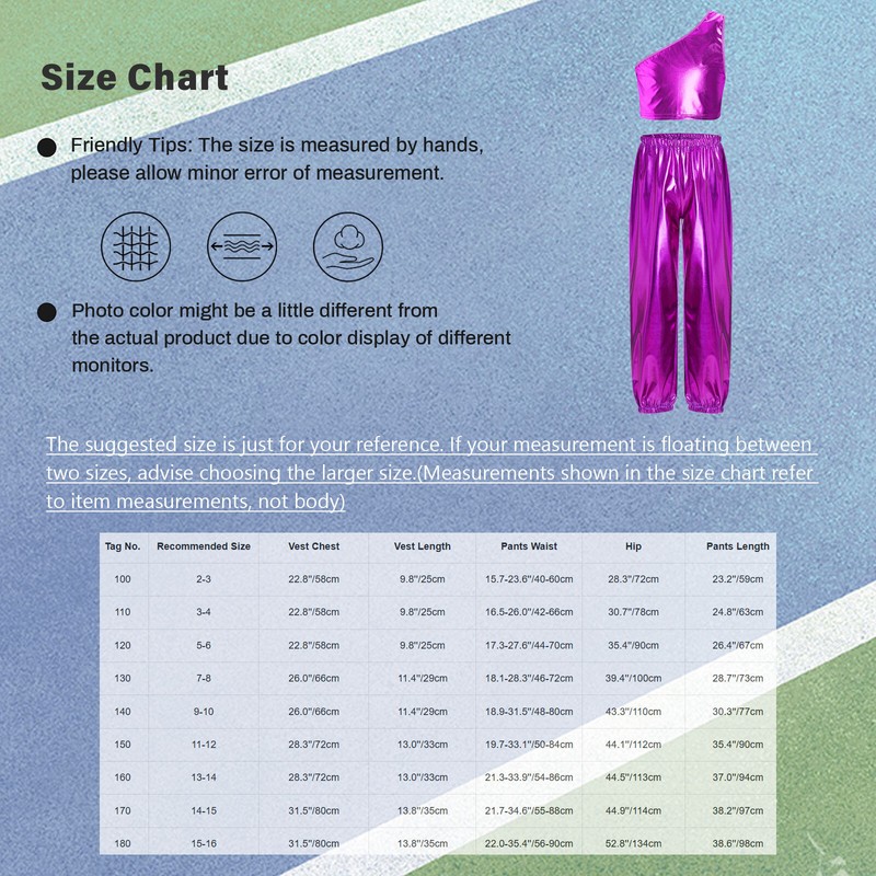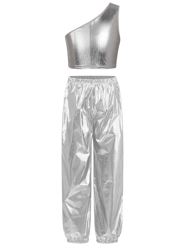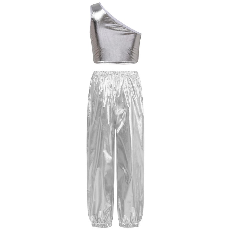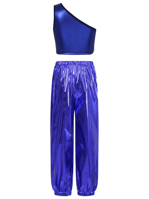 Single shoulder vest, slant shoulder, shiny metallic fabric, makes kids catch more eyes.