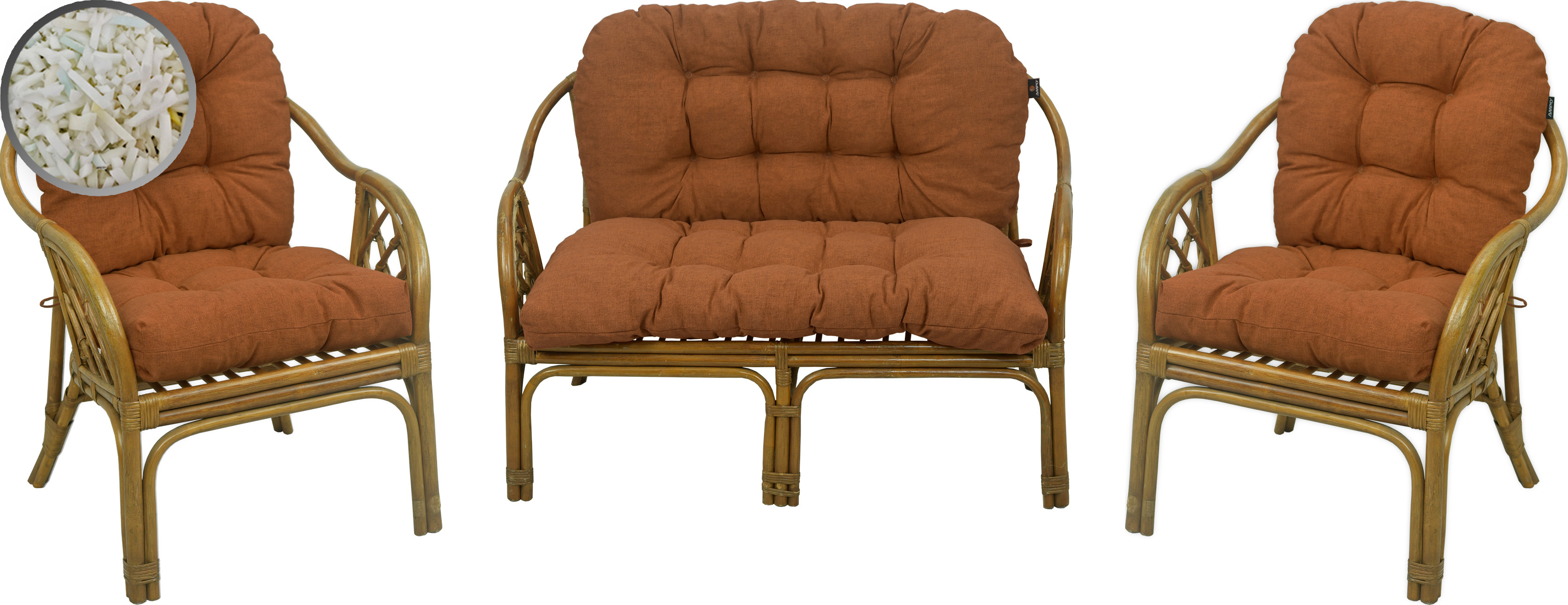 Jedes Möbelstück hat ein separates Kissen für Sitzfläche und Rückenlehne. Durch die Verwendung von PUR-Schaumgranulatfüllung konnte eine Dicke von ca. 10 cm erreicht werden.