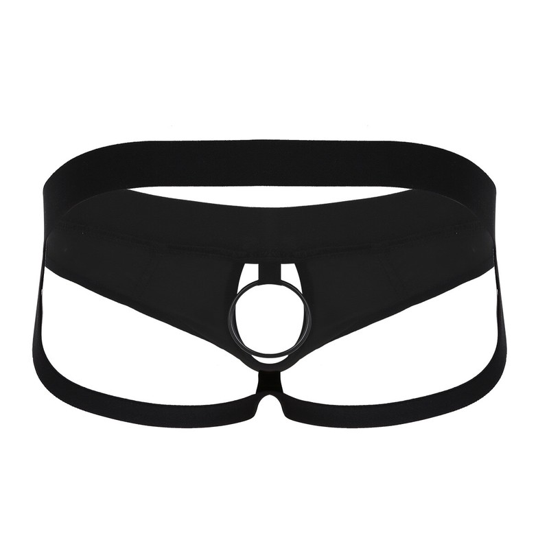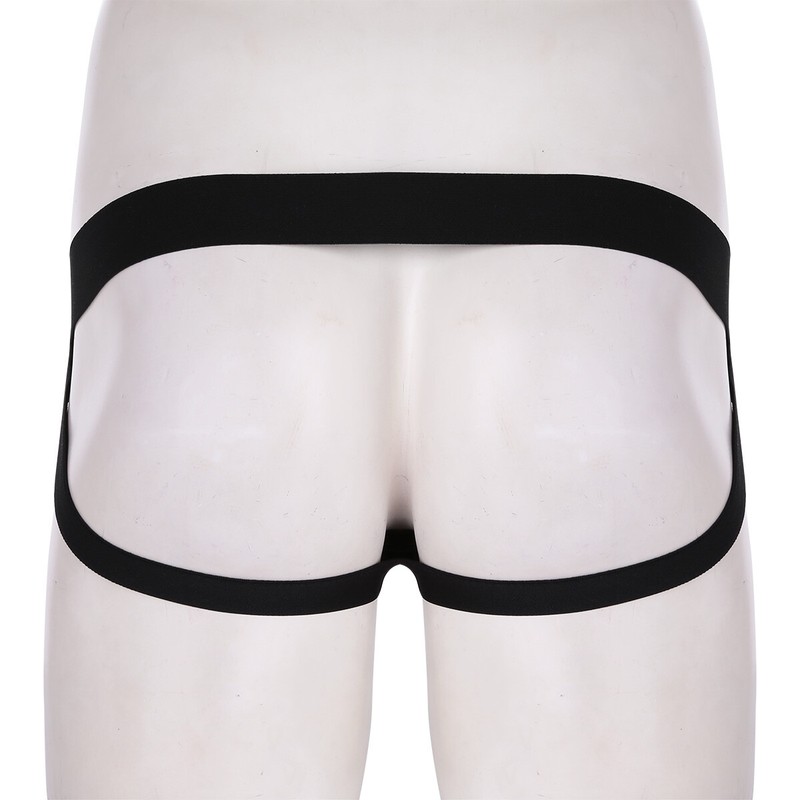 Wide elastic waistband with slidable closed penis strap circle.