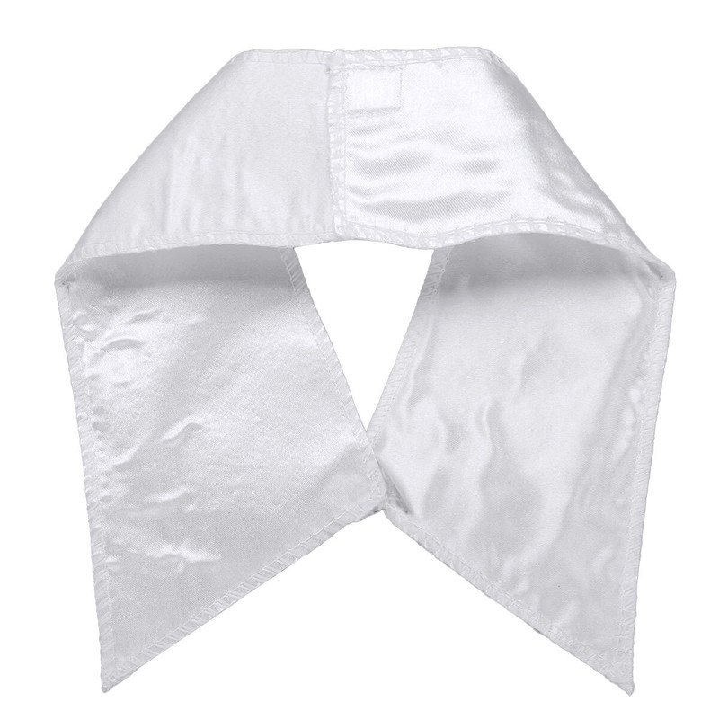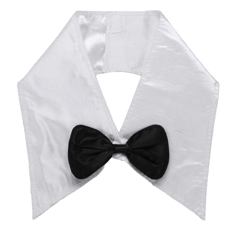 Hook and loop fastening collar with a stitched bow tie, cuffs with press button closure.