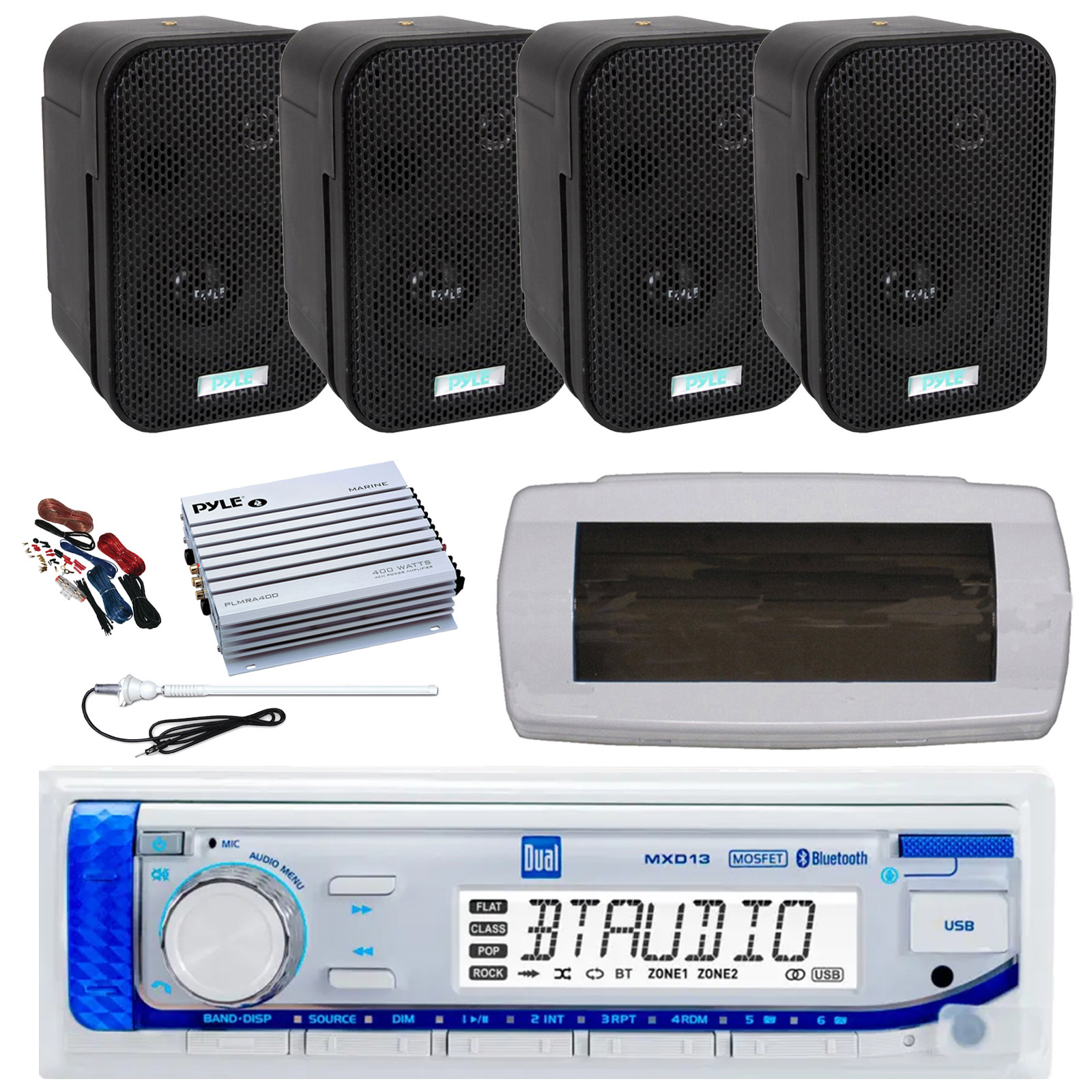 Dual MXD13 Single DIN Bluetooth Marine MP3 AM/FM Stereo Receiver with White Cover, Long Range Antenna, Amplifier w/Kit, 4x 3.5" 300W Max Indoor/Outdoor Waterproof Wall Mount Speakers (Black)