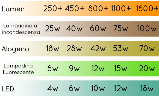 L'unità di misura del flusso luminoso di una sorgente di luce è il Lumen . Se desidera acquistare una lampadina potente non deve prestare attenzione ai Watt consumati bensì al numero di Lumen.