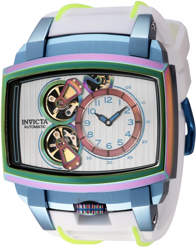 Silver-tone dial enhanced by blue hands. Ice Blue and Iridescent stainless steel case with a white silicone band. Automatic movement. 50 meters / 165 feet water resistance. Fixed bezel. Flame Fusion crystal. Solid caseback. Buckle clasp. Pull / Push crown. Case size 52 mm x 15.5 mm. Band 26 mm x 8.25 incheslong. Invicta 41701 Akula Watch.