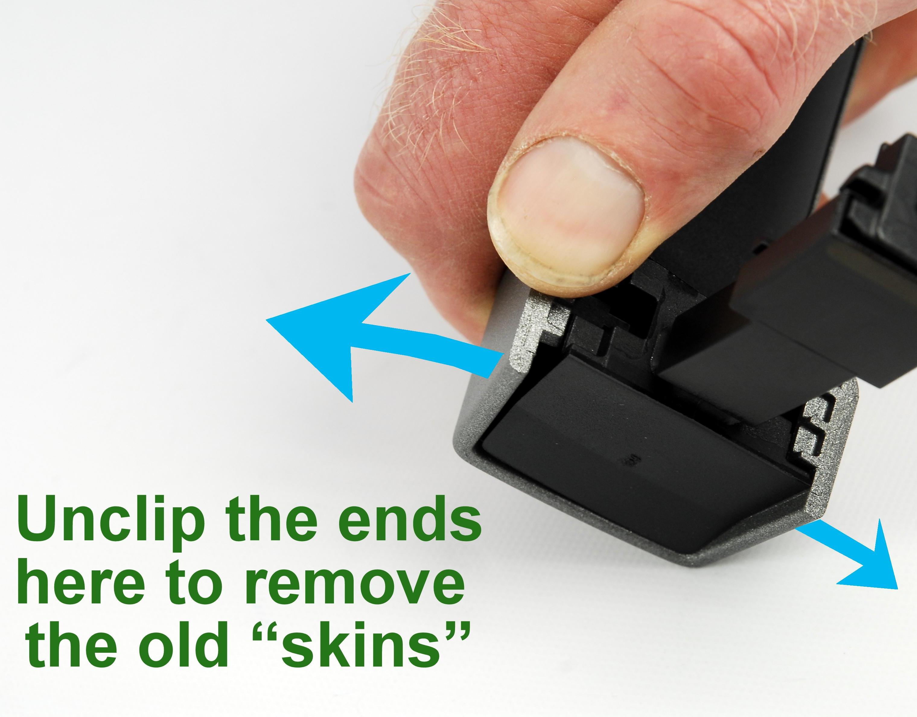- The skins are replacement fascias for the door handles - like changing the fascia on a mobile phone. Here you remove the old grey "skin" and replace with a body colour "skin"