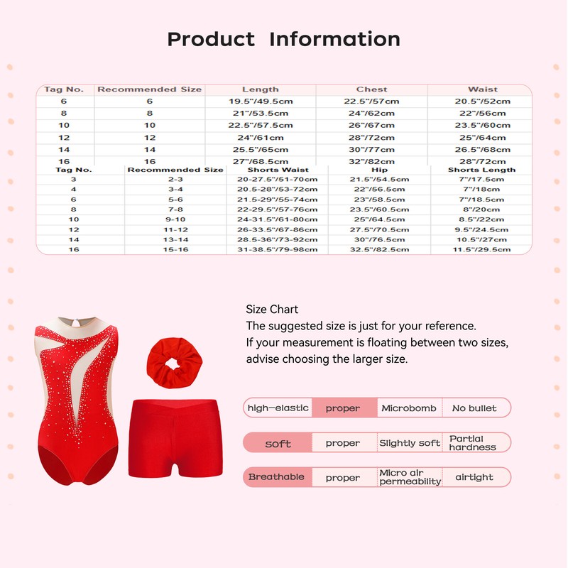 Size Chart: The suggested size is just for your reference. If your measurement is floating between two sizes, advise choosing the larger size. (Measurements shown in the size chart refer to item measurements, not body)| Tag No. | Recommended Size | Leotard Length | Chest | Leotard Waist | Shorts Waist | Hip | Shorts Length |