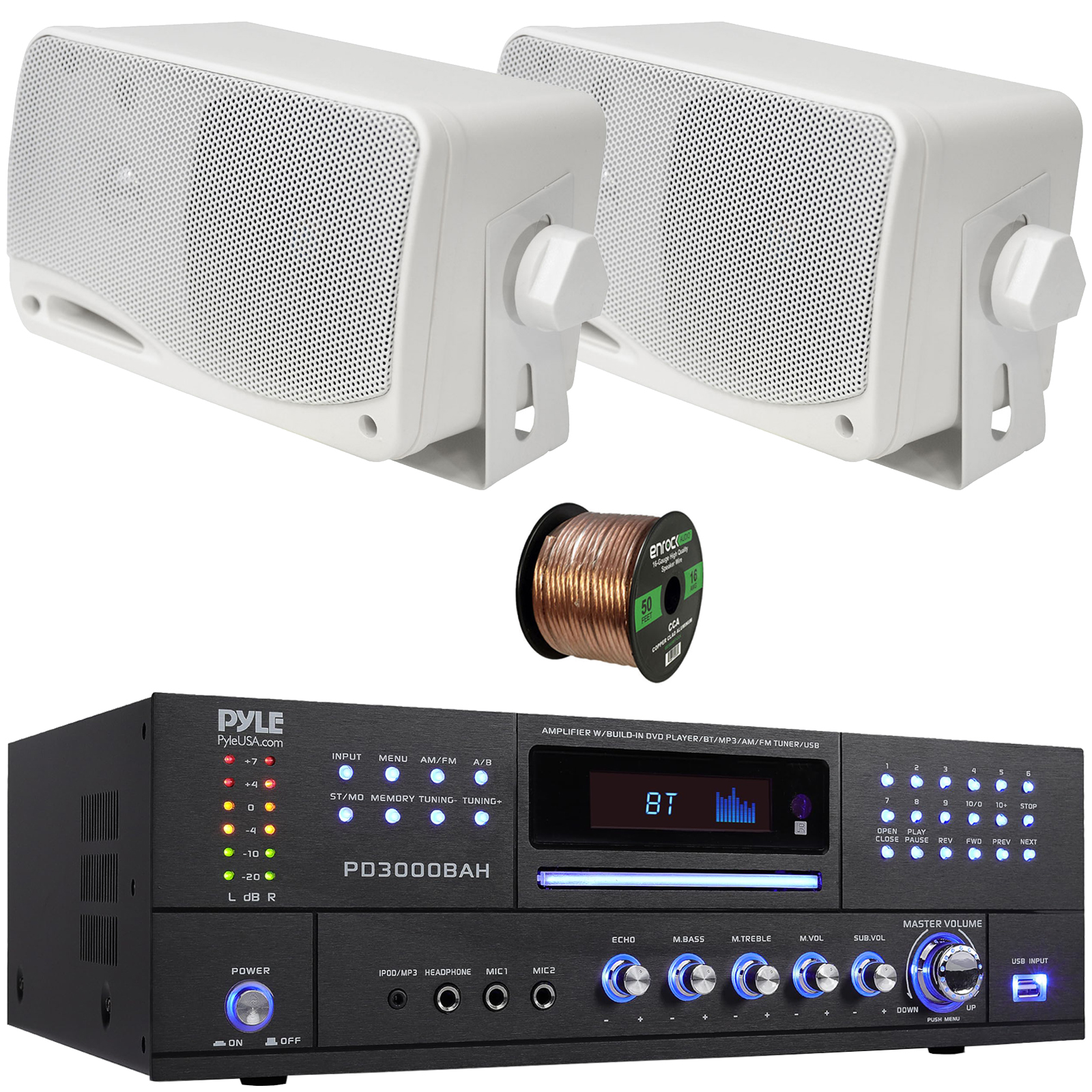 Pyle PD3000BAH 4-Channel 4000W Bluetooth Home Audio Amplifier Receiver – HDMI, USB, FM Radio, CD/DVD Player 2 Microphone, 2x 3.5'' 200 Watt Max Power 3-Way Weatherproof Mini Box White Speakers W/Wire