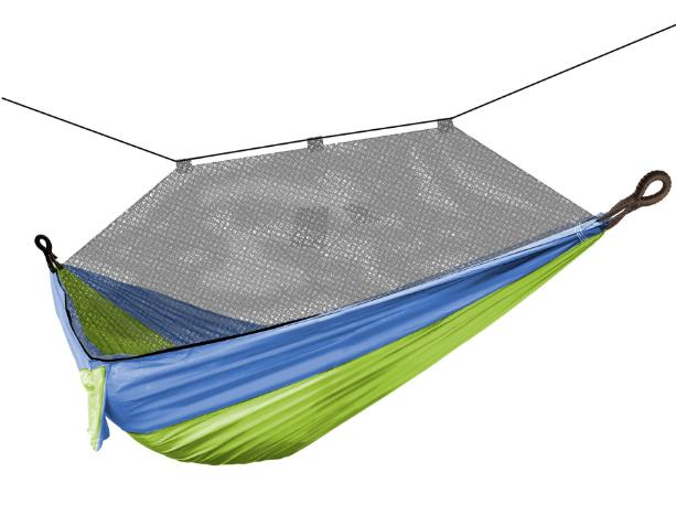 The Bliss To Go Camping Hammock in a Bag with Mosquito Net is the perfect portable hammock for those trips to campgrounds and parks. The To Go Hammock holds up to 350 pounds and folds neatly into its own pouch. It is made with strong yet lightweight nylon material and triple stitched Rip-Stop Polyester Dual-Color Fabric for durability. The Zippered mosquito net keeps those pesky bugs out while you're hammocking stopping anything from getting in the way of your relaxation. This hammock includes tree-friendly, tethering ropes help hang your hammock mosquito net to trees without damaging them. The included draw string bag is made from the same material has the hammock, matching the elegant pattern design. This hammock brings together tradition and comfort. With no assembly required and the design, this is perfect for on the go travel, camping, a stop in the park, or a nice set up for your backyard, the To Go Hammock in a Bag Travel Hammock is the most versatile hammock on the market!