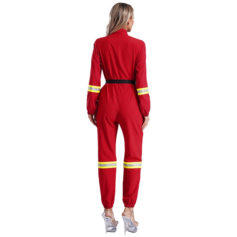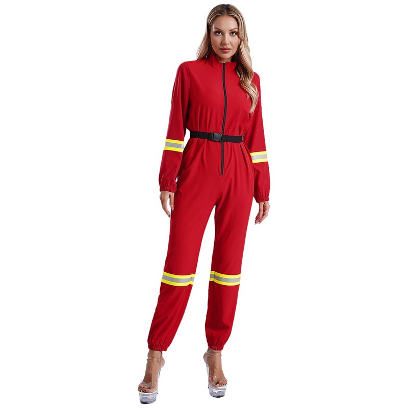 Women’s romper is designed with stand collar, long sleeve, bright color antiflaming band, front zipper; and matched with buckled belt.