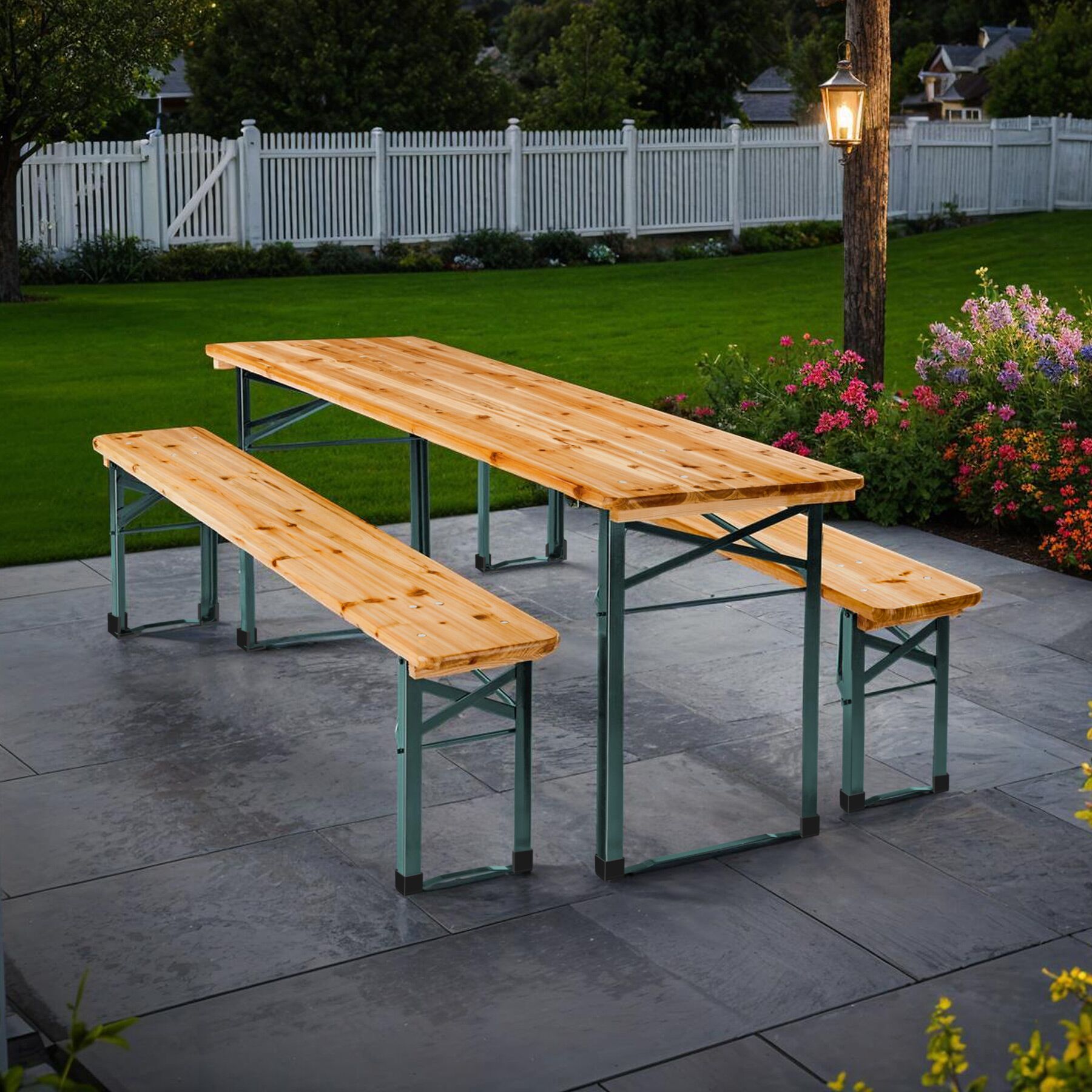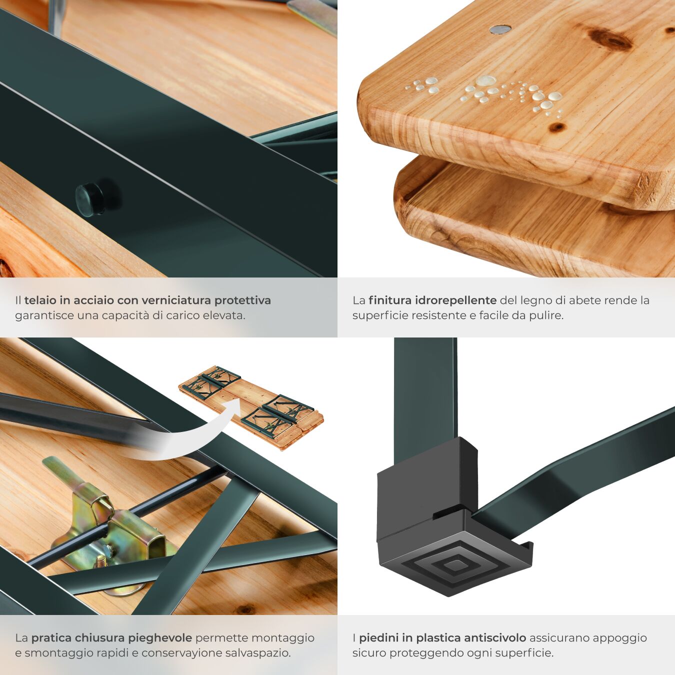 Gli elementi sono realizzati in legno di abete resistente, ottimamente protetto dagli agenti atmosferici grazie a una verniciatura durevole. Il telaio in acciaio verniciato offre inoltre la massima robustezza e garantisce un'eccellente stabilità su ogni superficie.