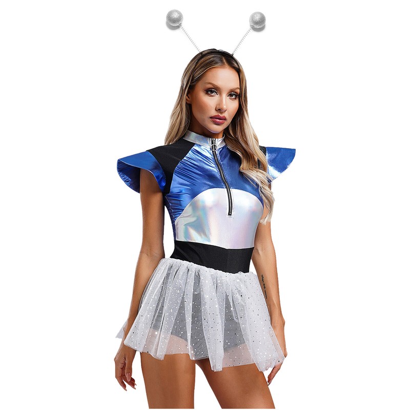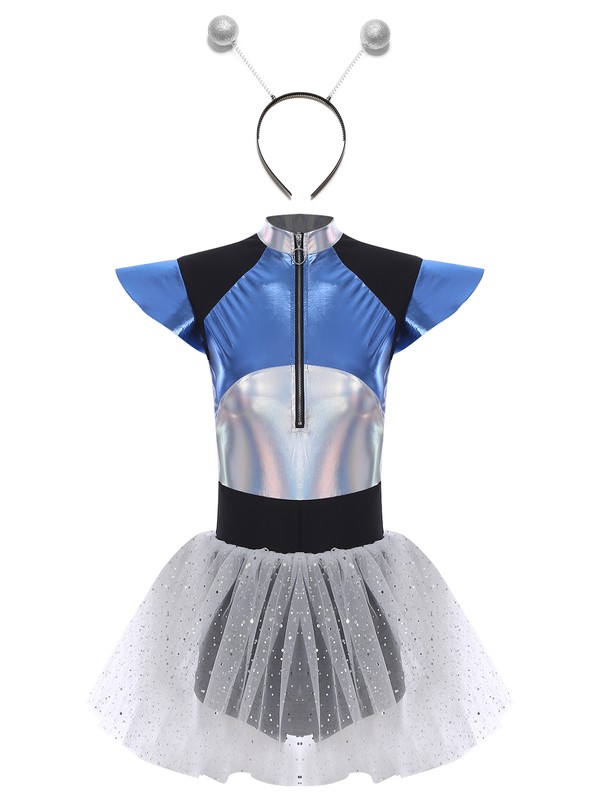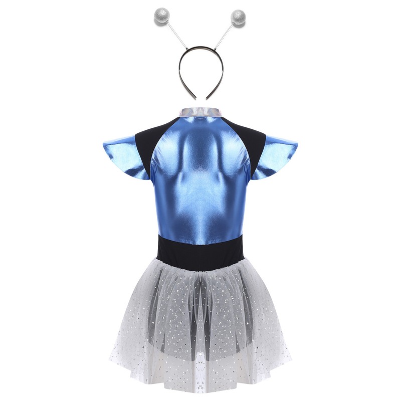 Metallic shiny fabric has unique luster to bring a sense of futuristic. Tulle skirt interspersed sequins, comes with a hair hoop.