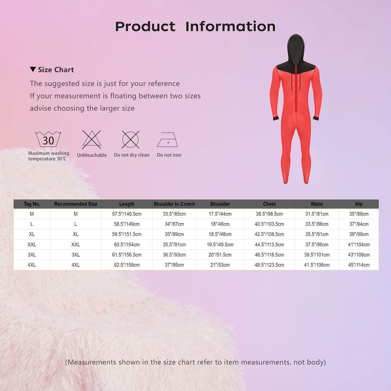 | Tag No. | Adult Recommended Size | Bust | Waist | Shoulder to Crotch |