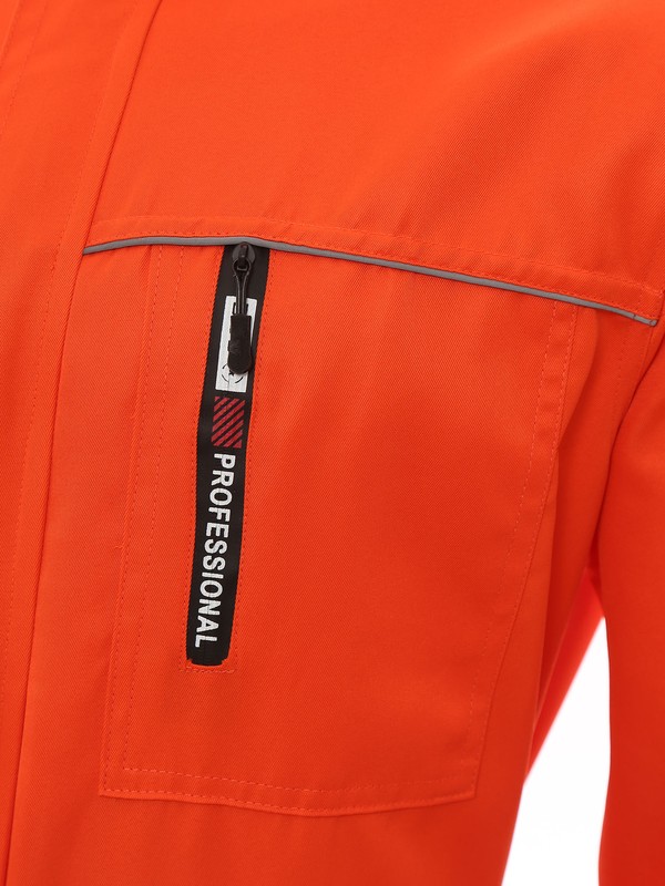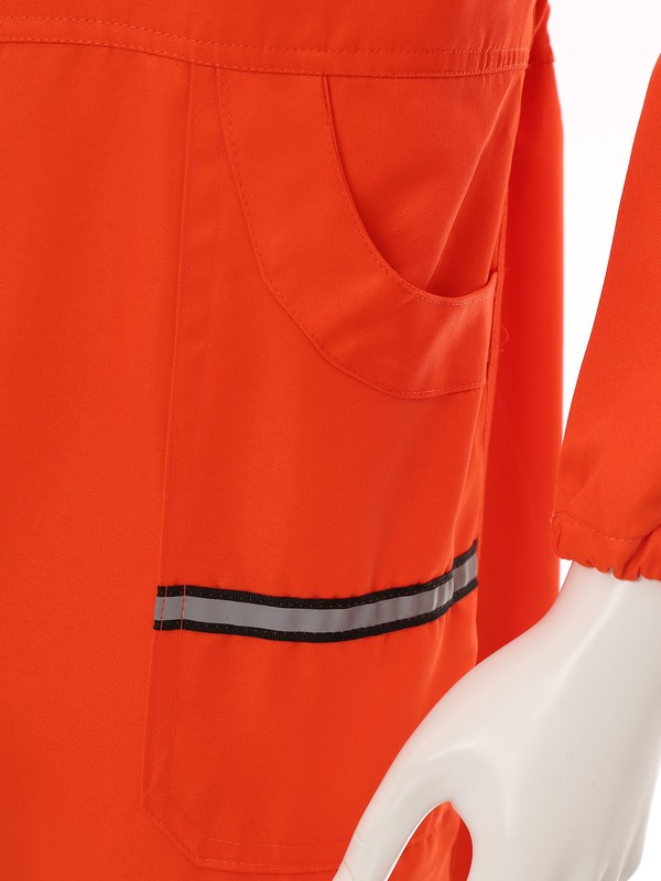 Unisex work jumpsuit fits for women and men, designs with stand collar, front zipper, elastic opening, multiple pockets, reflective stripes.