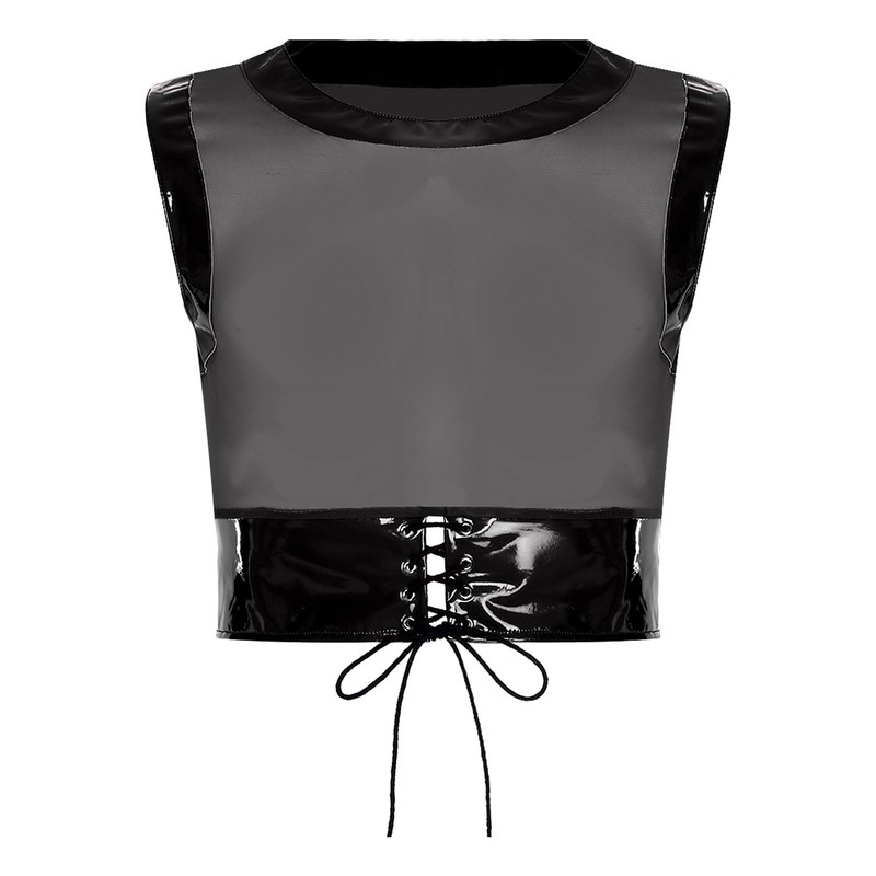 The round-neck sleeveless tank top with patent leather trim showcases a sleek and stylish look, making it stand out in the crowd.