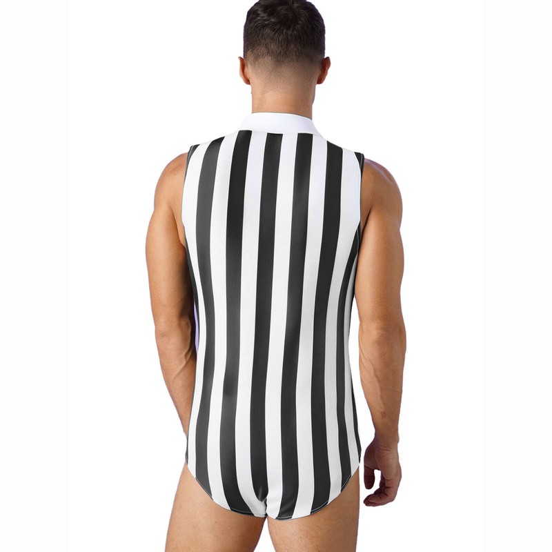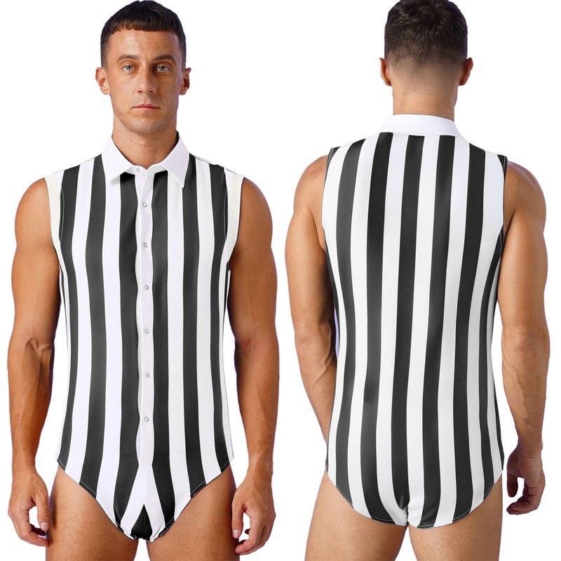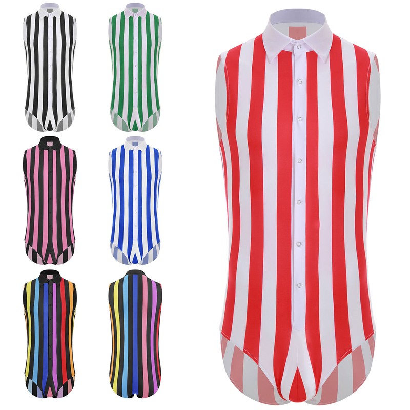 A bodysuit for men, is designed with lapel, sleeveless, short romper, front buttons are easy to put on and take off.