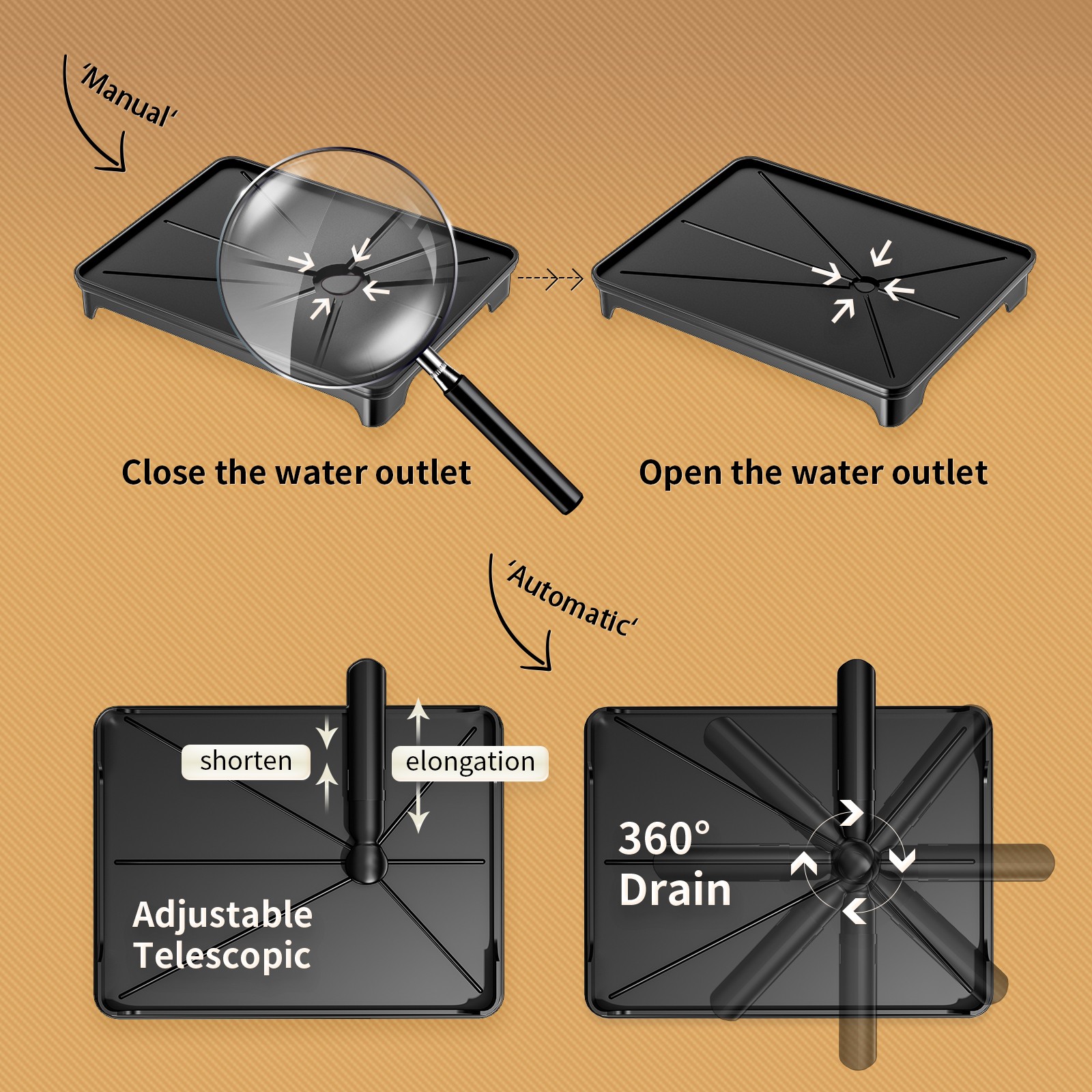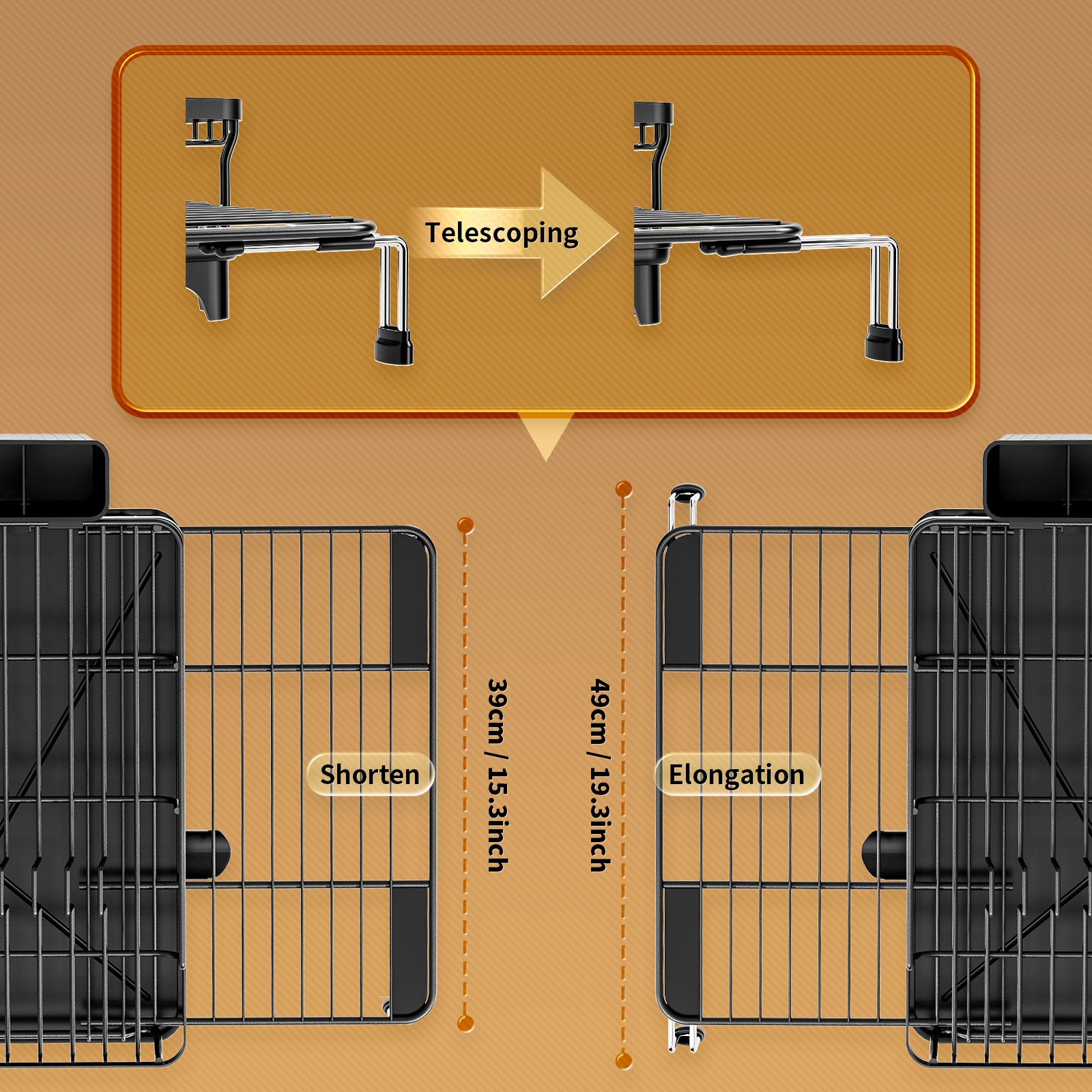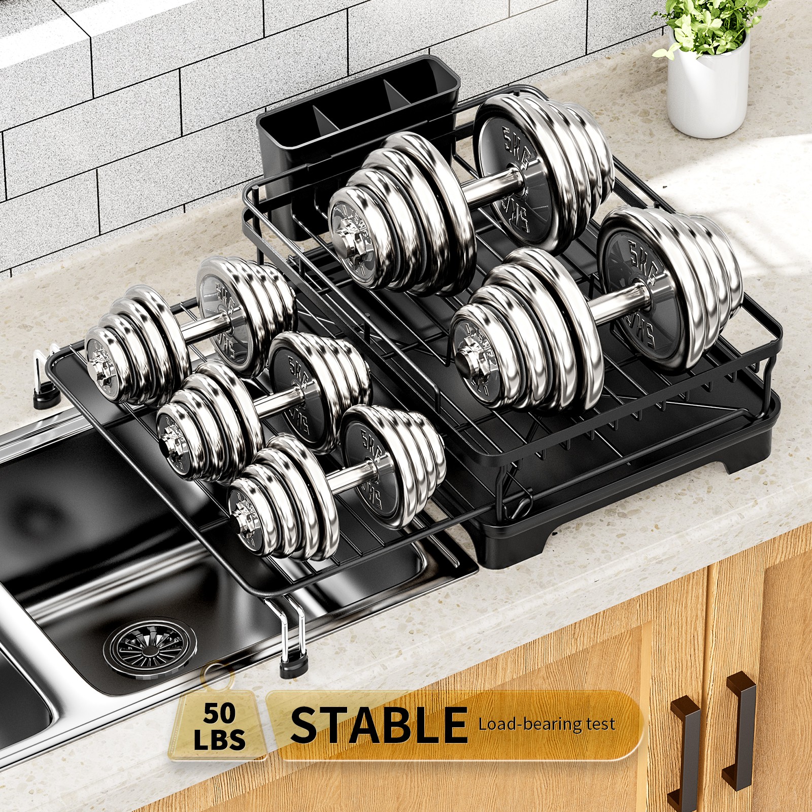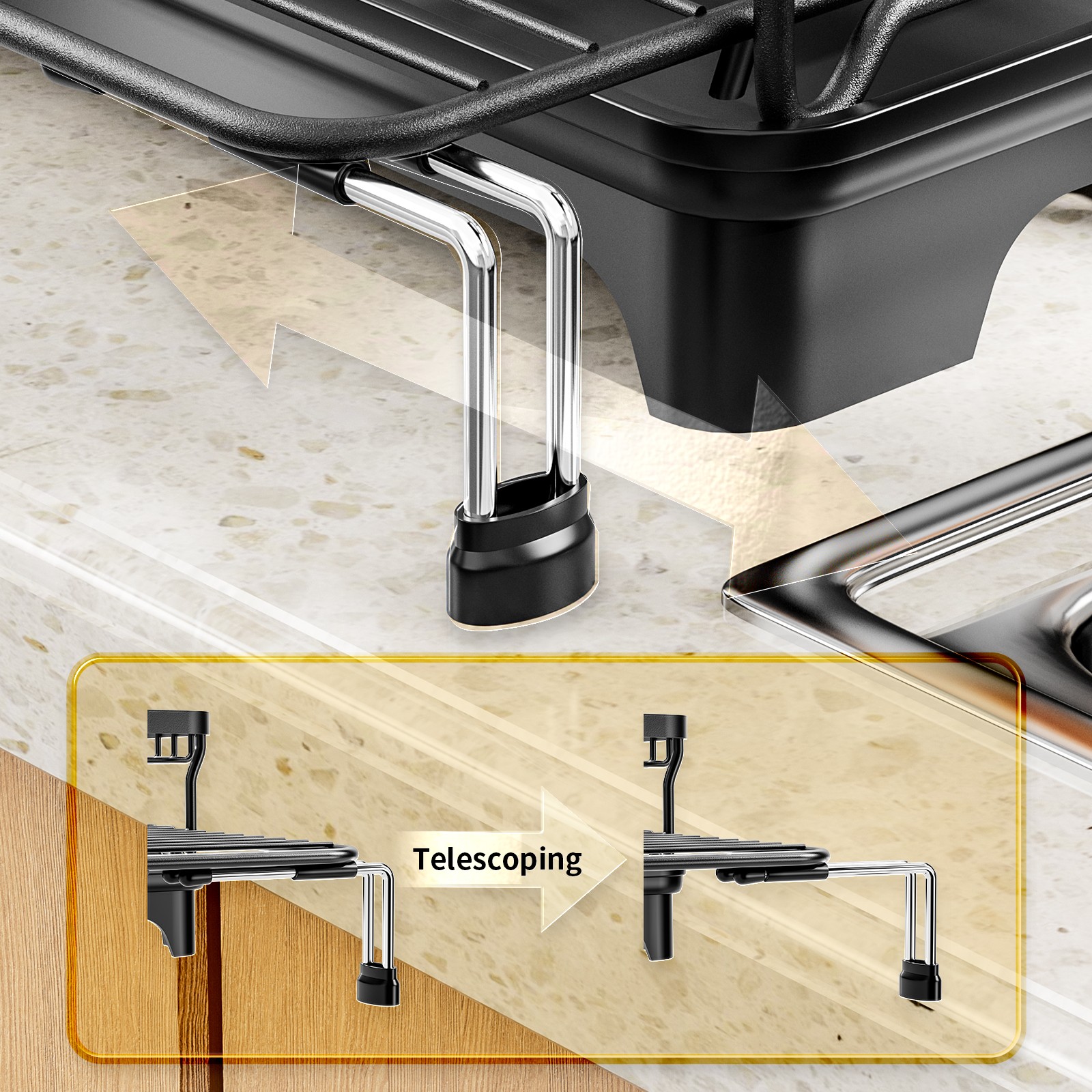 Adjustable extension feet: The clothes rack above the sink is equipped with 2 expandable feet, which can easily accommodate different sinks. The built-in fence ensures that large items are safely dry on the shelf, preventing them from tipping or sliding into the sink. (Tip: If not compatible, please ensure that the sink width is less than 21.2 inches before purchasing.)