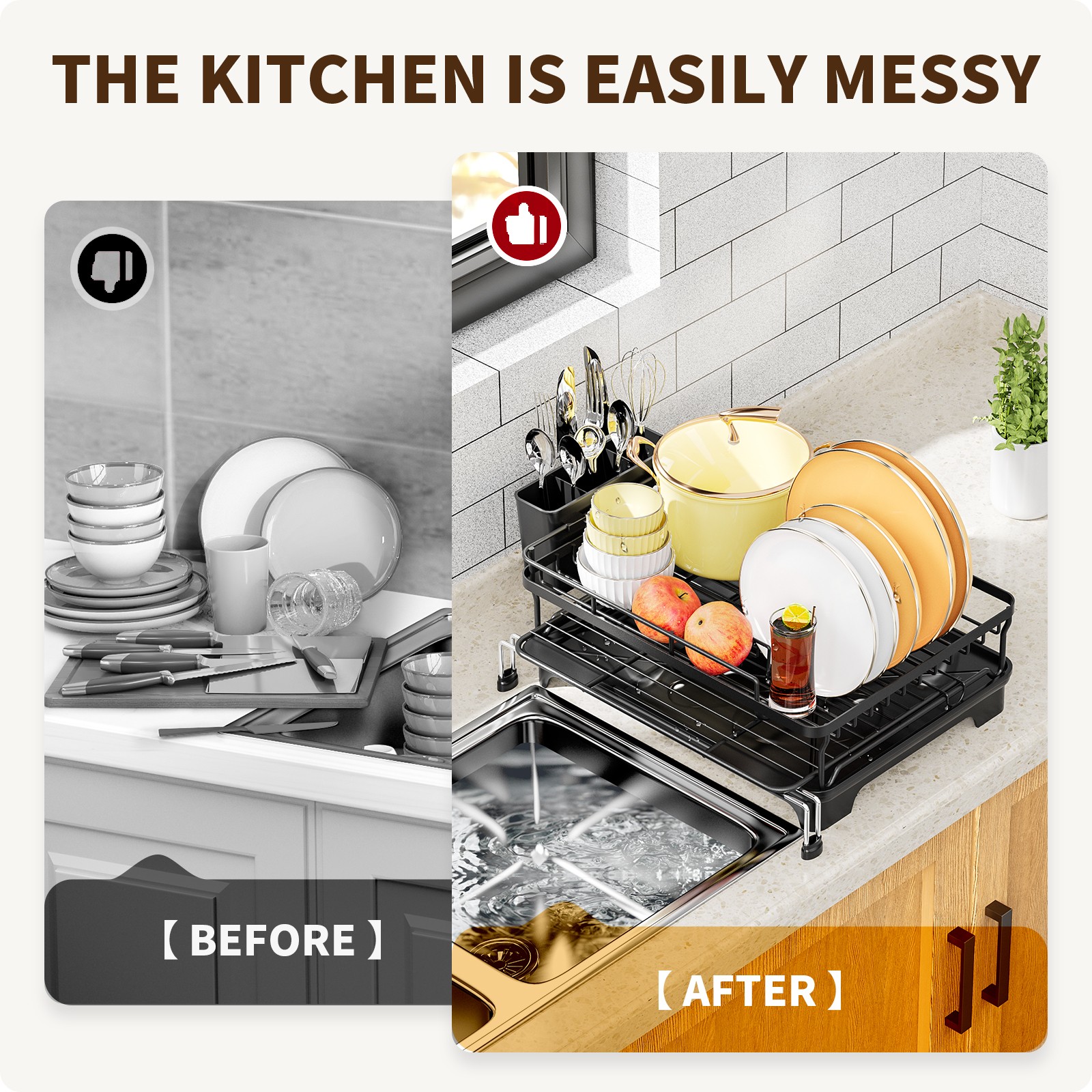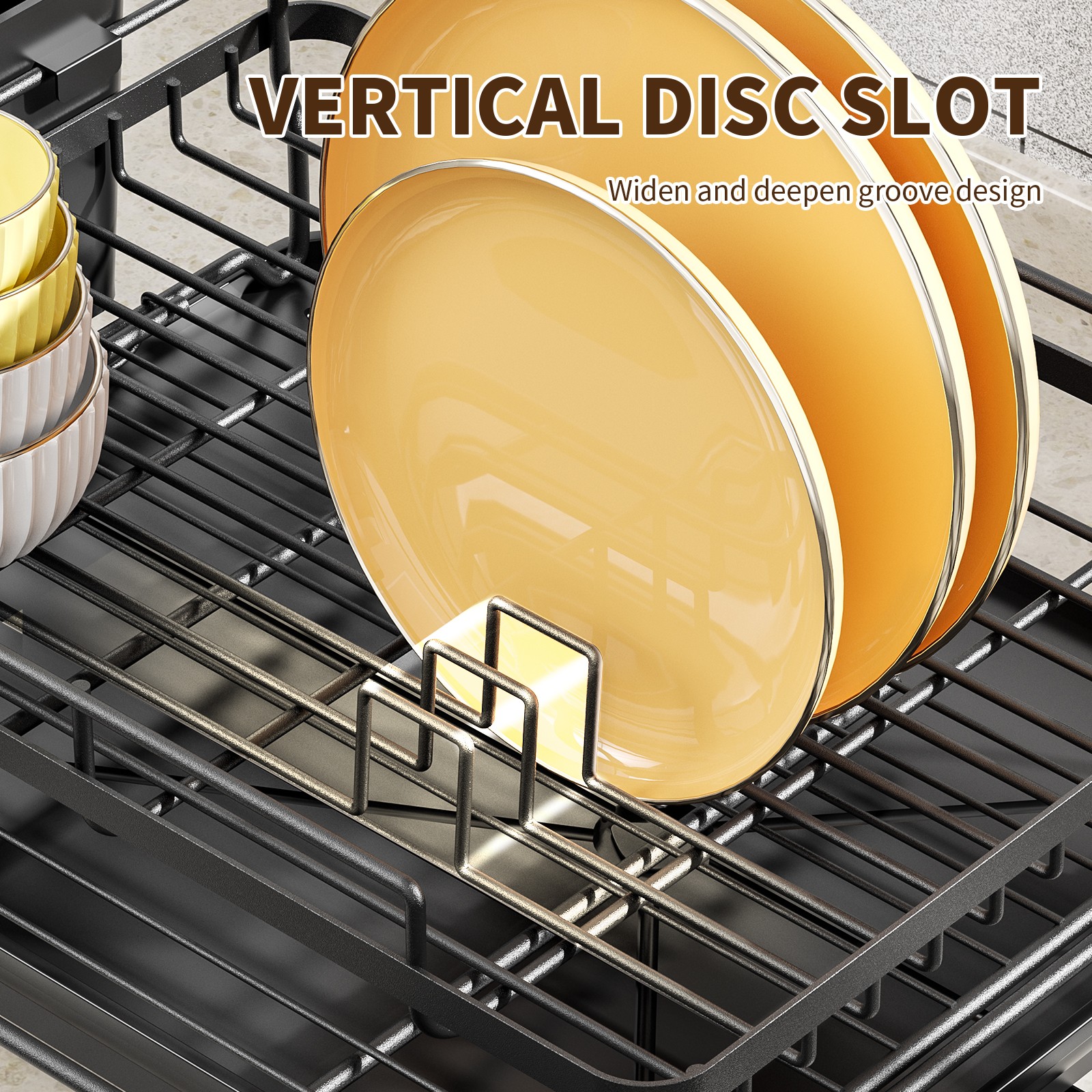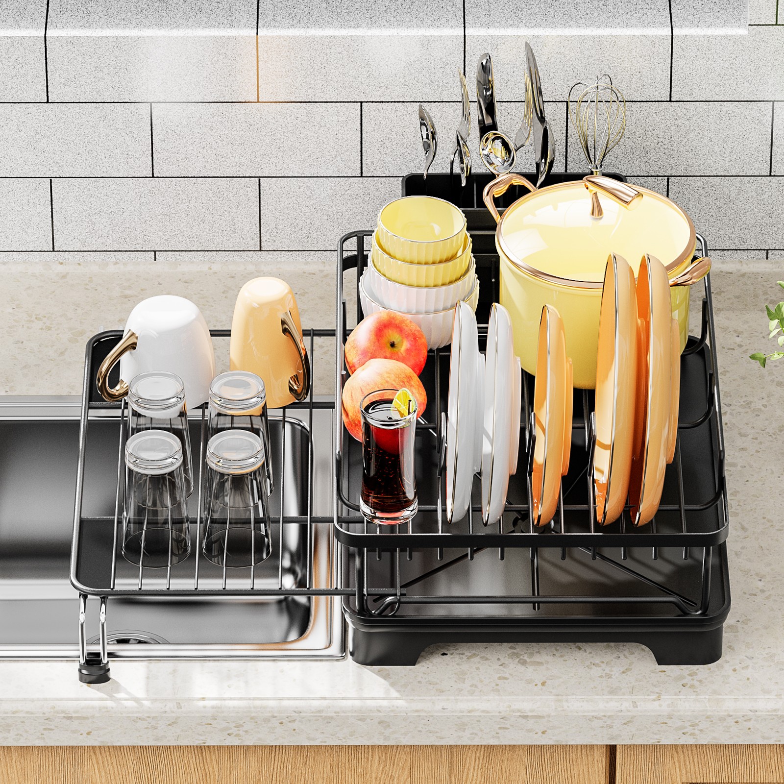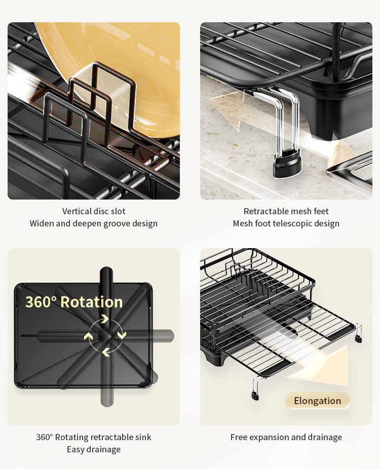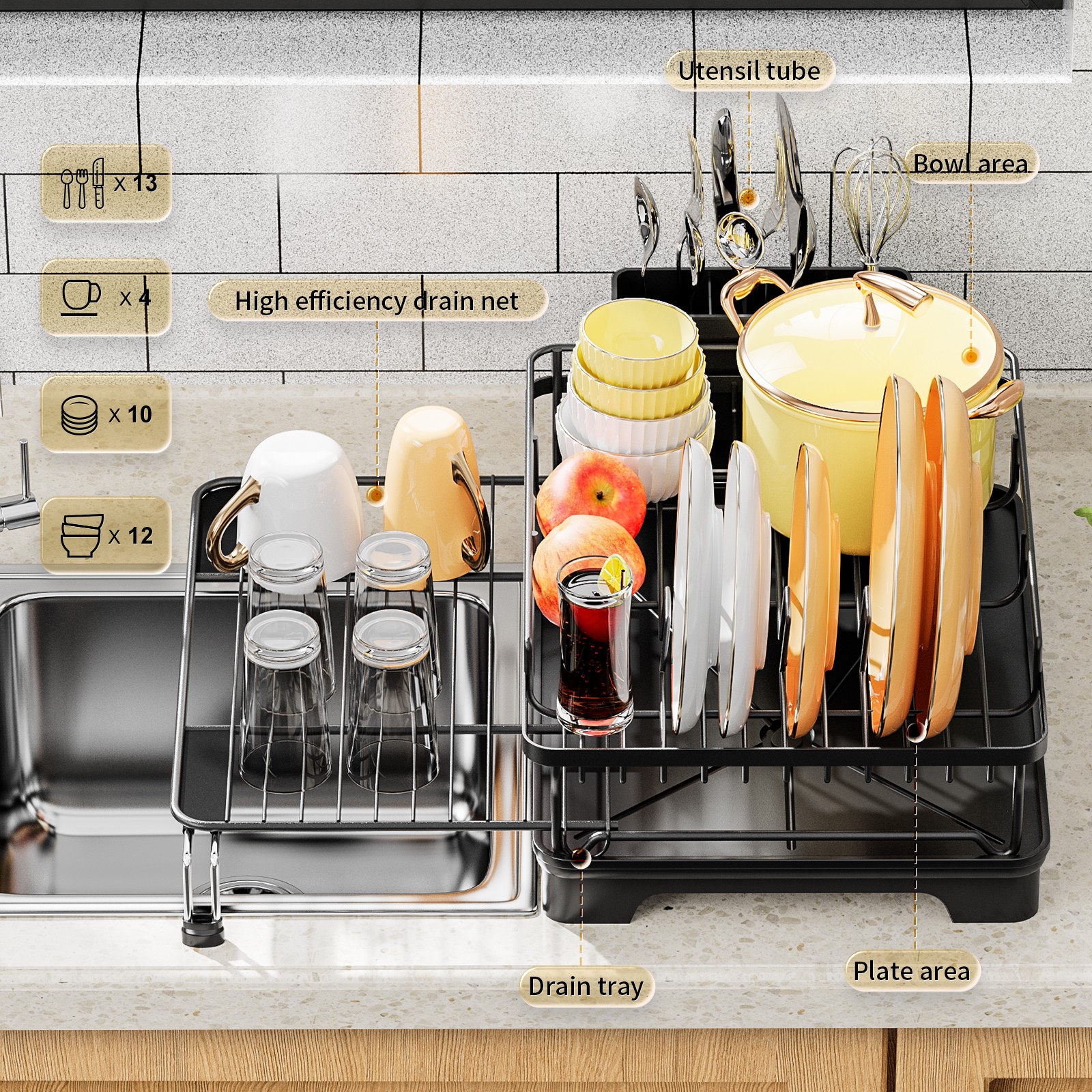 The plate drying rack is equipped with an expandable drying rack that can be installed on the sink. It features a 2-in-1 design that doubles the storage space and can accommodate 10 plates, 12 bowls, 4 glass cups, 1 pan, and a knife and fork storage box. Say goodbye to cluttered countertops and enjoy a tidy and orderly kitchen.