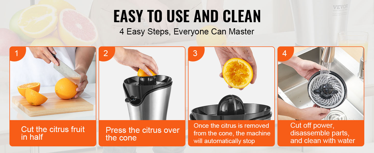 Easy to Use and Clean: Our orange juicer machine features a hassle-free way to enjoy fresh juice without any complex setup or operation. And with removable parts, the cleaning up after juicing has never been simpler. You can easily rinse these components clean or put them into the dishwasher. Spend less time cleaning and more time savoring your fresh citrus creations.