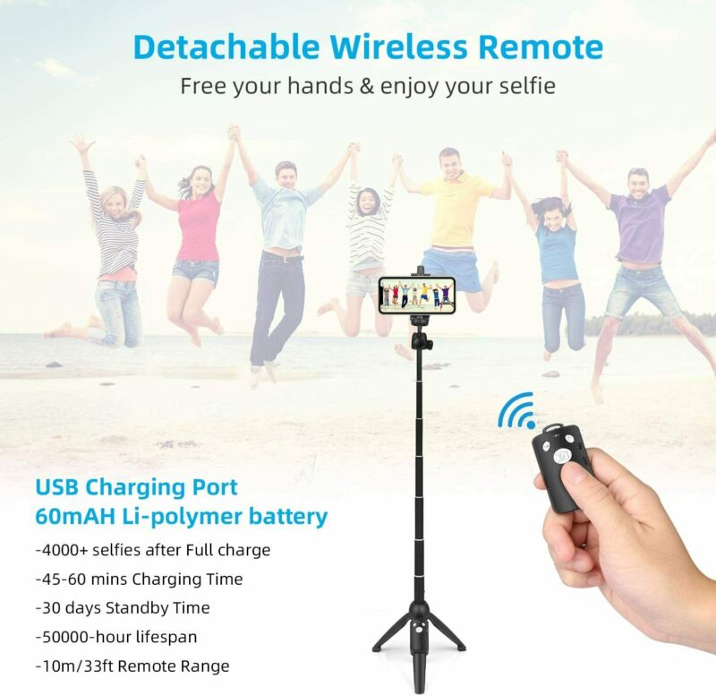 【Fast-to-Connect Detachable Bluetooth Wireless Remote】Never need to grasp the selfie stick when taking group photos. Wireless remote control is featured by fast connection speed, low cost, long service life and 10m/33ft control range (Note: Just for high-quality 60mAh battery of mobile phones and Bluetooth cameras). Charge the Bluetooth remote control via micro USB. after 45-60 minutes fully charging.