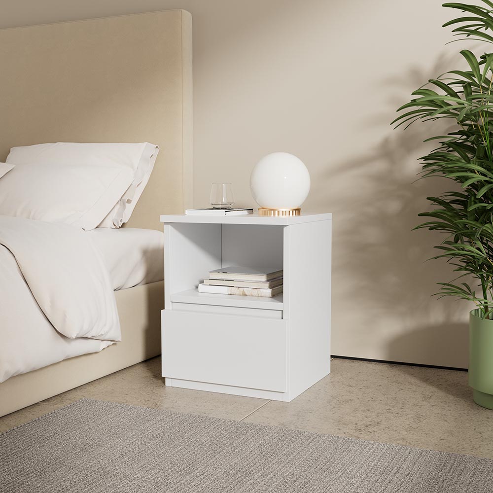 Design and Aesthetics: Crafted with clean lines and a sleek profile, this nightstand exudes a sense of understated elegance. The pure white finish gives it a fresh, bright appearance that can effortlessly lighten up the ambiance of your bedroom.
