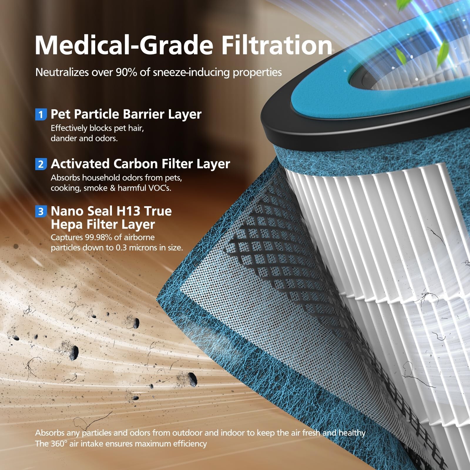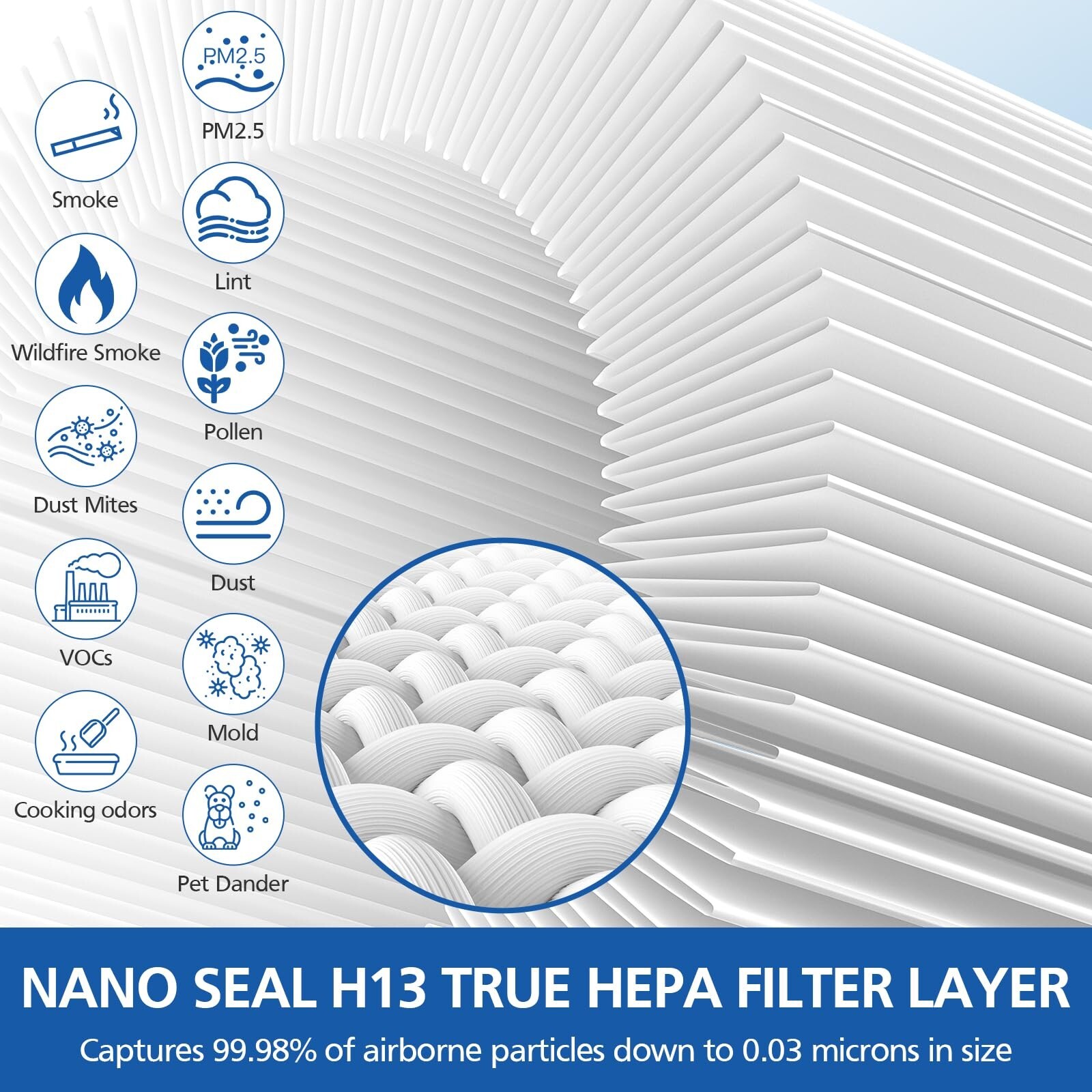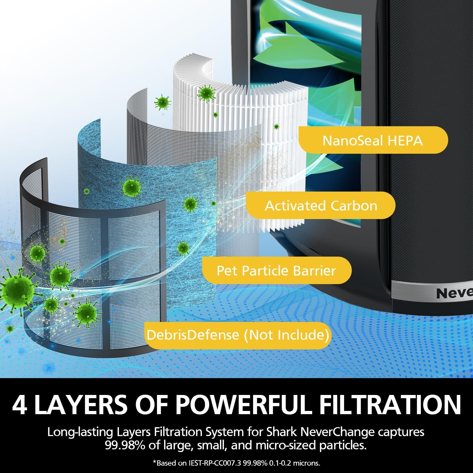 3 STAGE FILTRATION NEVERCHANGE FILTER: Multi-stage filtration include Pet Particle Barrier Layer, High-Efficiency Activated Carbon Filter layer and H13 True HEPA Filter layer, which makes this HP152 filter effectively captures 99.98% of particles, both large and small, including dust, hair, pet dander, and pollen (tested according to IEST-RP-CC007.3 standards for 0.10.2 microns). Double activated carbon particles effectively filter household odors from pets, cooking, PM2.5, smoke, and harmful VOCs.
