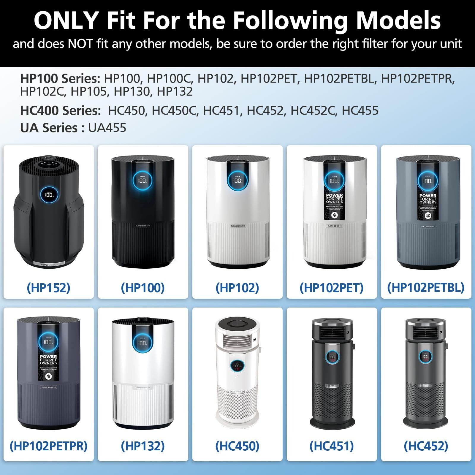 PERFECT COMPATIBILITY: HP152 True HEPA filter replacement ONLY COMPATIBLE WITH Shark Air Purifier model: HP100 Series: HP152, HP100, HP100C, HP102, HP102PET, HP102PETBL, HP102PETPR, HP102C, HP105, HP130, HP132 HC400 Series: HC450, HC450C, HC451, HC452, HC452C, HC455 UA Series : UA455 Compare to Part # HE1FKPET, HE1FKBAS, HP102PETBL, HP102PETPR HP102PET, HE1FKBASMB