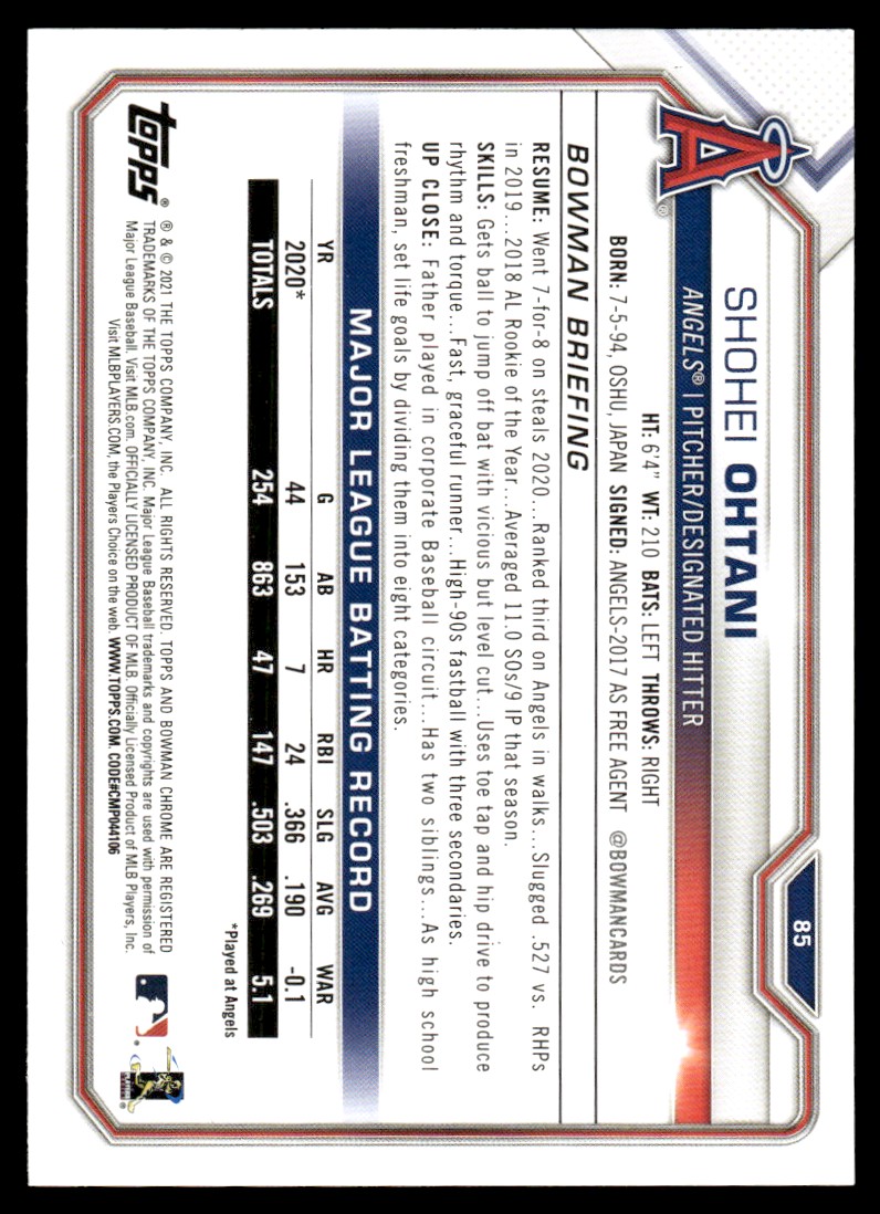 | 2021 Bowman Shohei Ohtani Los Angeles Angels #85 |