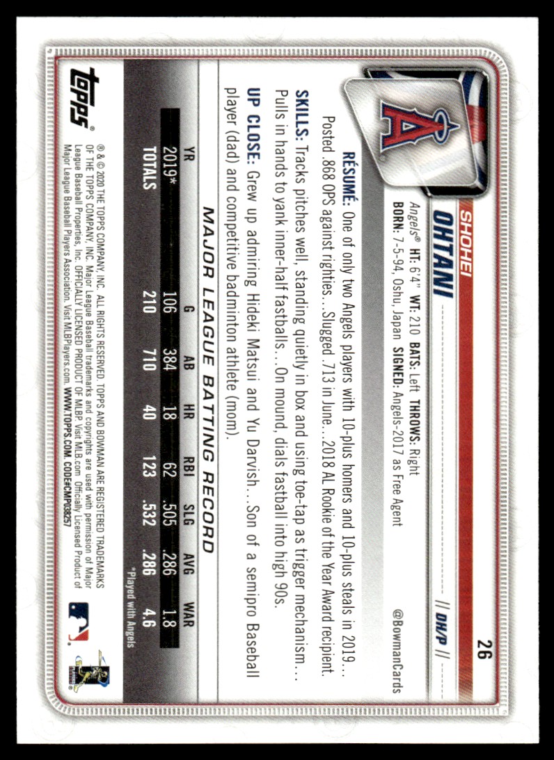 | 2020 Bowman Shohei Ohtani Los Angeles Angels #26 |