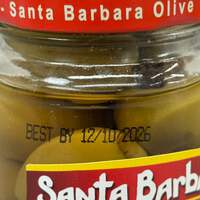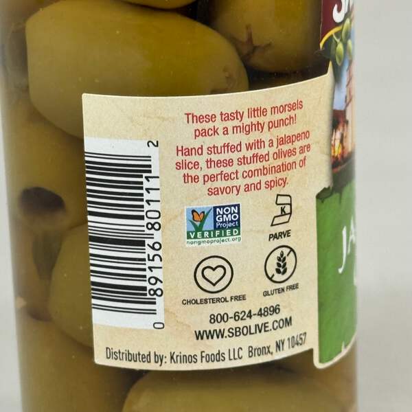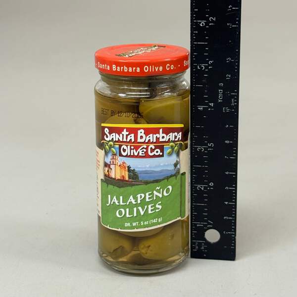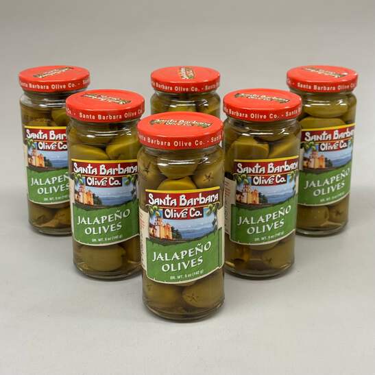 SANTA BARBARA OLIVE CO Jalapeno Stuffed Olives BB 12/26 Condition: New Size: 8oz Pack Size: 6 Pack Color: Green Best By: 12/10/2026 Ingredients: Olives serrano/jalapeno peppers water sea salt vinegar (may contain pit fragments.)