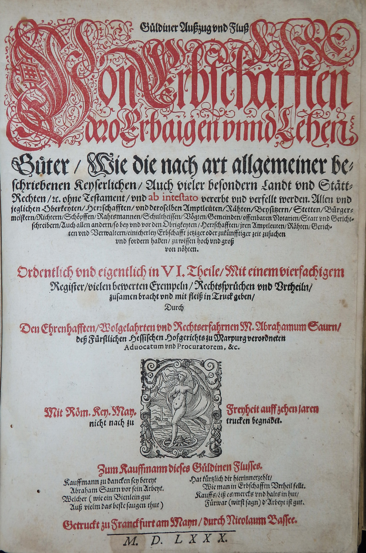 Erste Ausgabe dieses bedeutenden Erbrechtskommentars des kaiserlichen Notars und Richters am hessischen Hofgericht in Marburg.