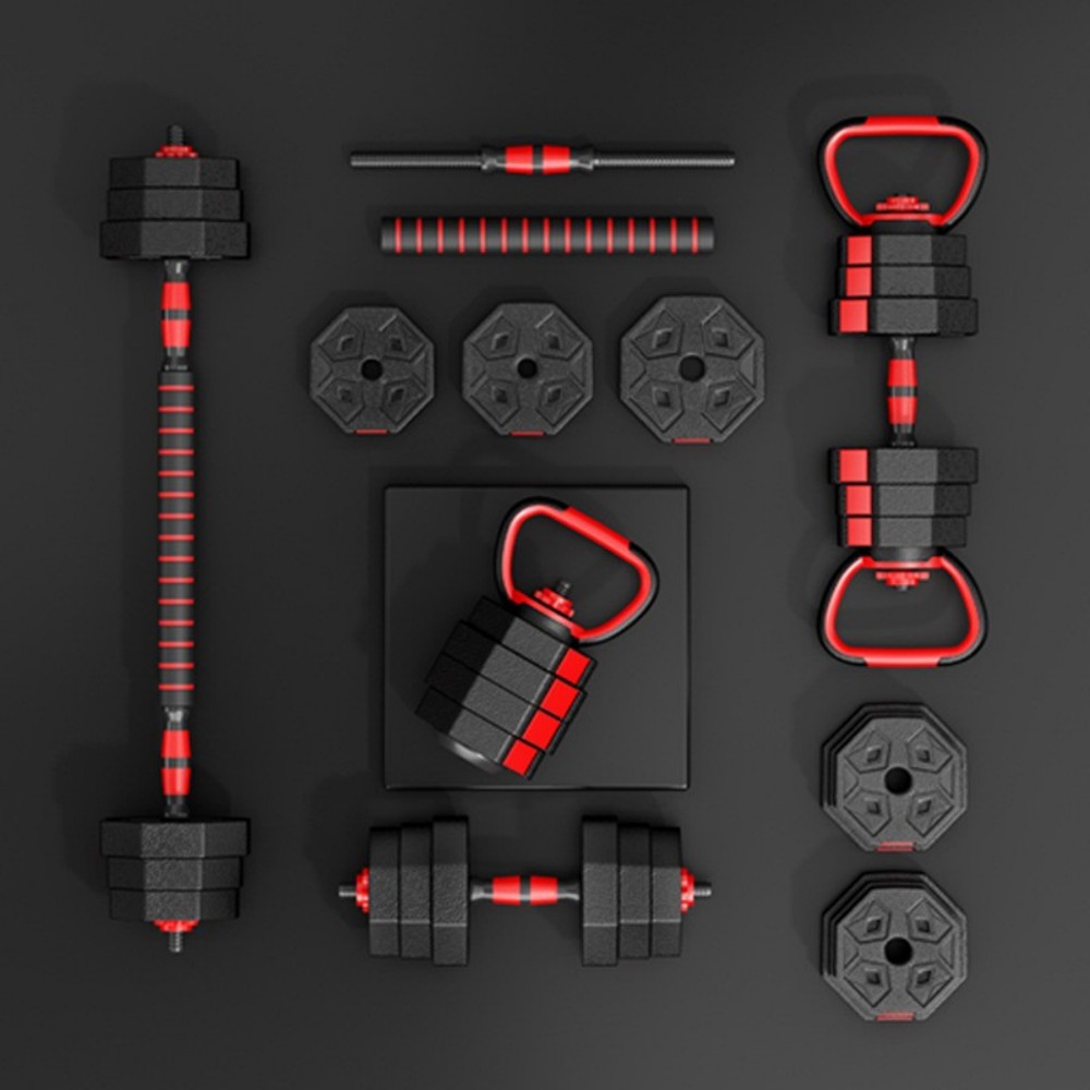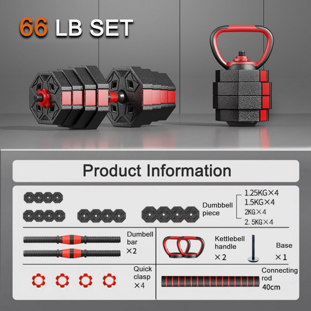 Weight Packaging List - The 66 pound fitness dumbbell set includes: 4 pieces of 2.75 pound weight plates, 4 pieces of 3.3 pound weight plates, 4 pieces of 4.4 pound weight plates, 4 pieces of 5.5 pound weight plates, 4 dumbbell nuts, 1 connecting rod, 2 dumbbell rods, 2 kettlebell handles, and 1 kettlebell base.
