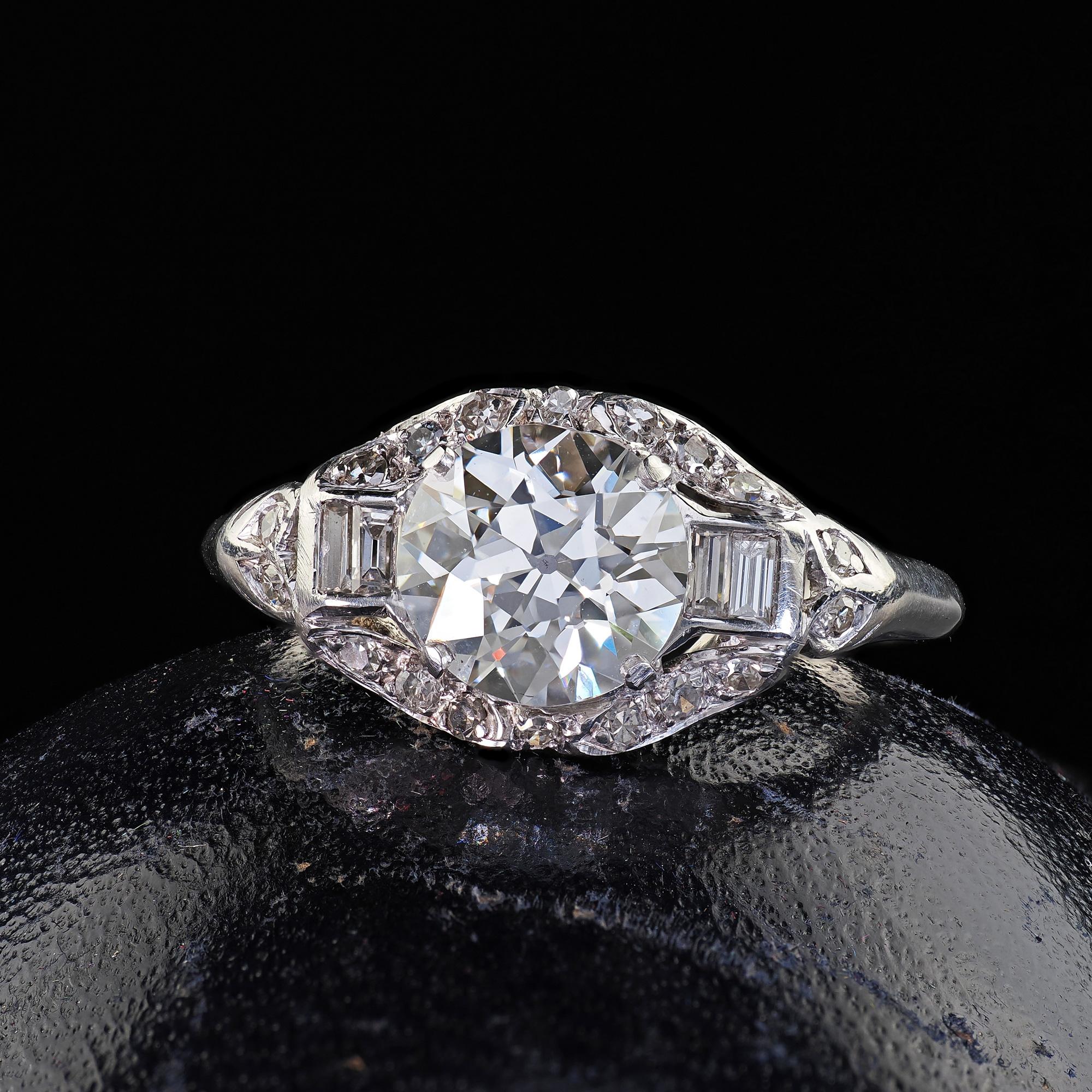 Beautiful Antique Art Deco Platinum Old European Diamond Baguette Engagement Ring - GIA. This beautiful Art Deco old European cut diamond engagement ring is crafted in platinum. The ring features a beautiful old European cut diamond in the center of a low profile Art Deco diamond baguette mounting. The ring sits low on the finger and is in good condition.