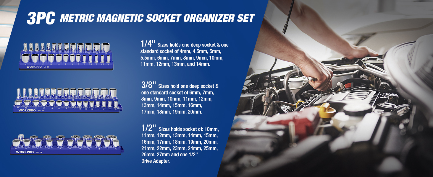 πLarge Capacity Magnetic Socket Organizer Set: These magnetic socket organizers can store up to 75 metric sockets. The kit includes three blue metric magnetic socket organizers for 1/4", 3/8" and 1/2" drives. They collect metric receptacles but not for impact sockets. Tip: sockets are not included with the holders.